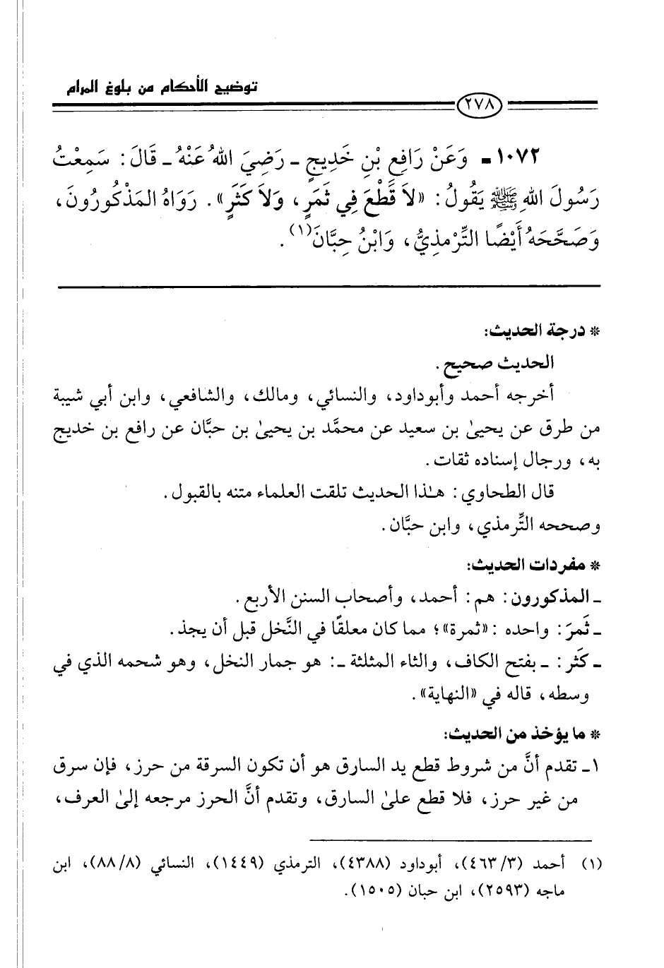 1072 - وَعَنْ رَافِعِ بْنِ خَدِيجٍ -رَضِيَ اللهُ عَنْهُ- قَالَ: سَمِعْتُ رَسُولَ اللهِ -صلى الله عليه وسلم- يقُولُ: "لاَ قَطْعَ فِي ثَمَرٍ، وَلاَ كَثَرٍ". رَوَاهُ المَذْكُورُونَ، وَصَحَّحَهُ أَيْضًا التِّرْمذِيُّ، وَابْنُ حِبَّانَ (¬1).