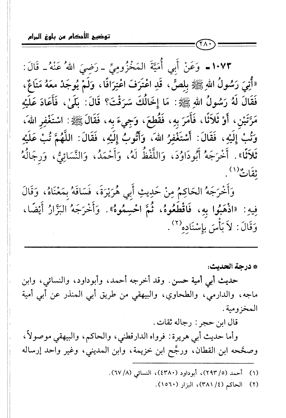 1073 - وَعَنْ أَبِي أُمَيَّةَ المَخْزُومِيِّ -رَضِيَ اللهُ عَنْهُ- قَالَ: "أُتِيَ رَسُولُ اللهِ -صلى الله عليه وسلم- بِلِصٍّ، قَدِ اعْتَرَفَ اعْتِرَافًا، وَلَمْ يُوجَدْ معَهُ مَتَاعٌ، فَقَالَ لَهُ رَسُولُ اللهِ -صلى الله عليه وسلم-: مَا إِخَالُكَ سَرَقْتَ؟ قَالَ: بلَى، فَأَعَادَ عَلَيْهِ مَرَّتَيْنِ، أَوْ ثَلاَثًا، فَأَمَرَ بِهِ، فَقُطعَ، وَجِيءَ بِه، فَقَالَ -صلى الله عليه وسلم-: اسْتَغْفِرِ اللهَ، وَتُبْ إِلَيْهِ، فَقَالَ: اسْتَغْفِرُ اللهَ، وَأَتُوبُ إِلَيْهِ، فَقَالَ: اللَّهُمَّ تُبْ عَلَيْهِ ثَلاَثًا". أَخْرَجَهُ أَبُو دَاوُدَ، وَاللَّفْظُ لَهُ، وَأَحْمَدُ، وَالنَّسَائِيُّ، وَرِجَالُهُ ثِقَاتٌ (¬1).