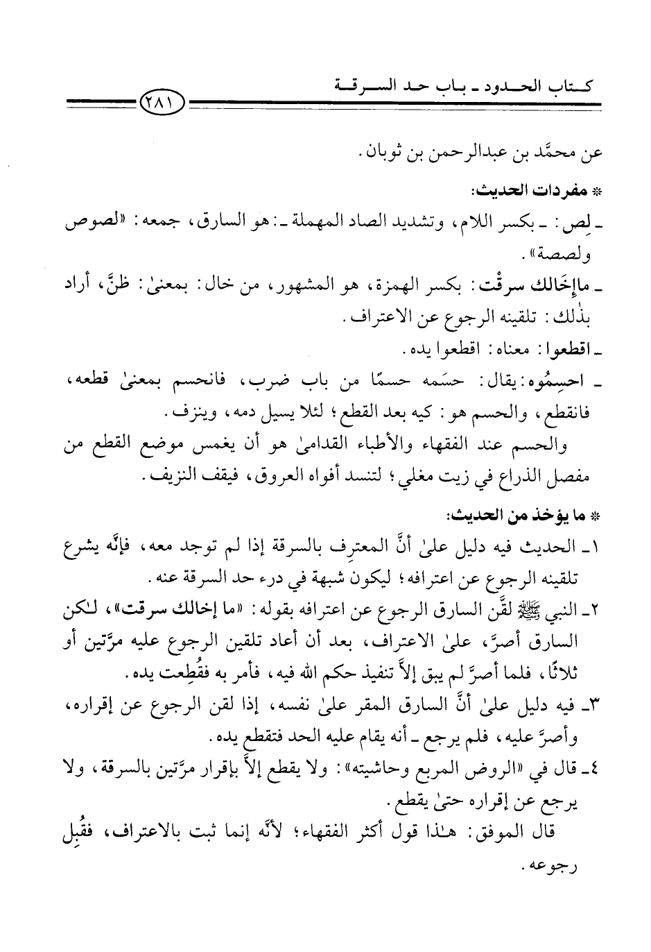 2 - النبي -صلى الله عليه وسلم- لقَّن السارق الرجوع عن اعترافه بقوله: "ما إخالك سرقت"، لكن السارق أصرَّ، على الاعتراف، بعد أن أعاد تلقين الرجوع عليه مرَّتين أو ثلاثًا، فلما أصرَّ لم يبق إلاَّ تنفيذ حكم الله فيه، فأمر به فقُطِعت يده.
