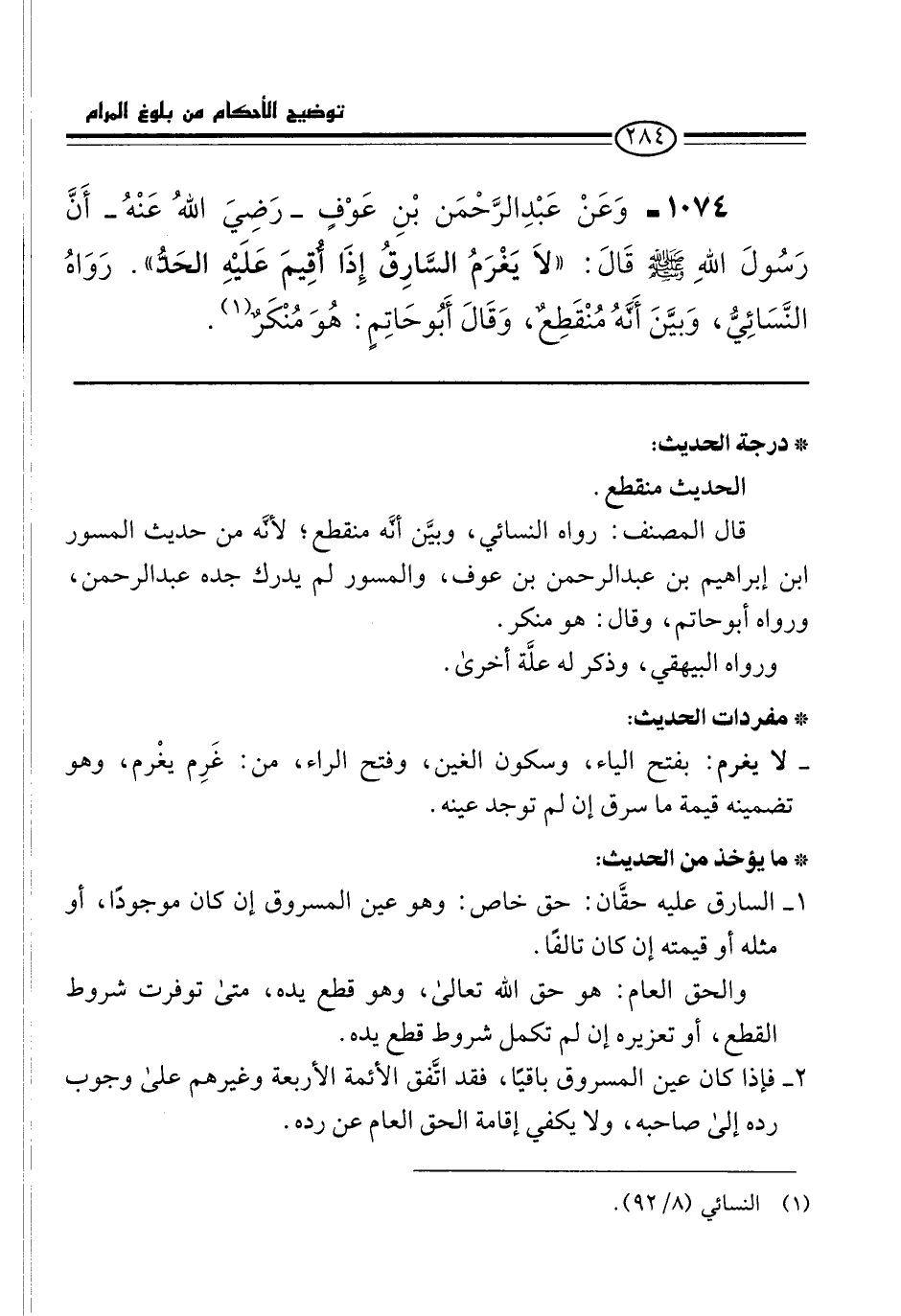 1074 - وَعَنْ عَبْدِ الرَّحْمَن بْنِ عَوْفٍ -رَضِيَ اللهُ عَنْهُ- أَنَّ رَسُولَ اللهِ -صلى الله عليه وسلم- قَالَ: "لاَ يَغْرَمُ السَّارِقُ إِذَا أُقِيمَ عَلَيْهِ الحَدُّ". رَوَاهُ النَّسَائيُّ، وَبيَّنَ أَنَّهُ مُنْقَطِعٌ، وَقَالَ أَبُو حَاتِمٍ: هُوَ مُنْكَرٌ (¬1).