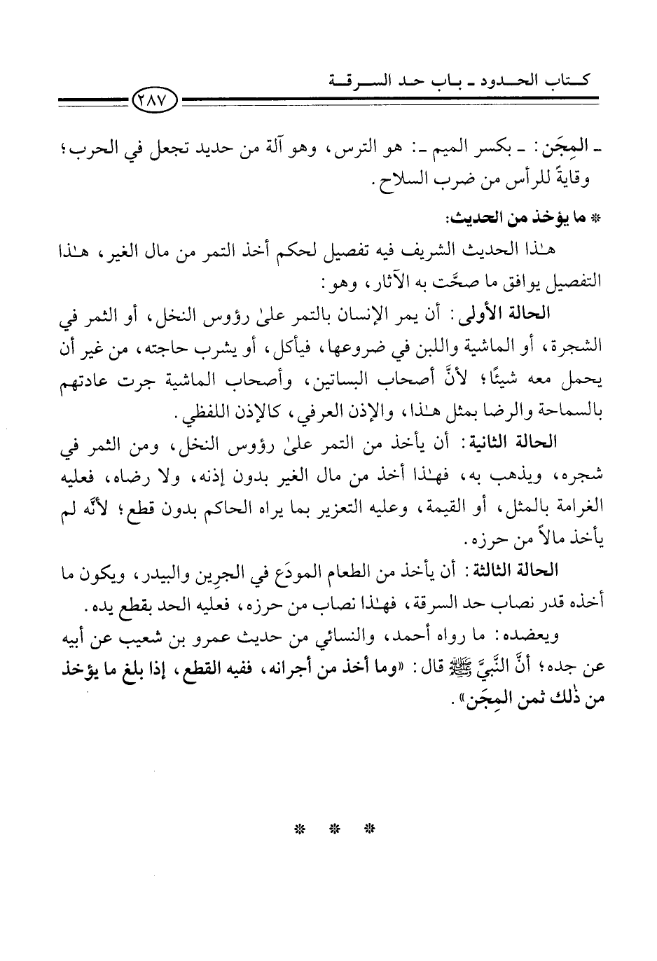 الحالة الثالثة: أن يأخذ من الطعام المودعَ في الجرِين والبيدر، ويكون ما أخذه قدر نصاب حد السرقة، فهذا نصاب من حرزه، فعليه الحد بقطع يده.
