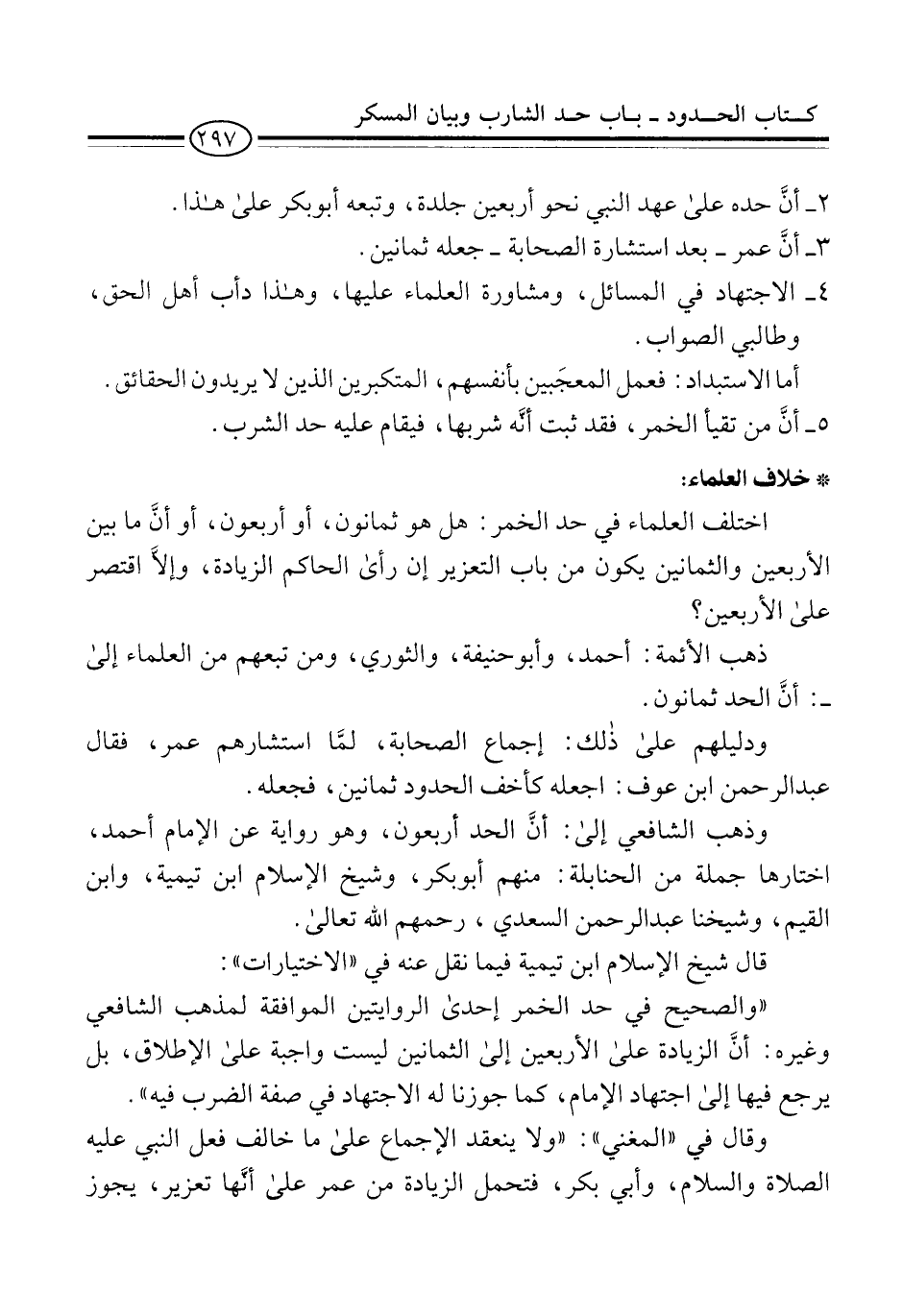 "والصحيح في حد الخمر إحدى الروايتين الموافقة لمذهب الشافعي وغيره: أنَّ الزيادة على الأربعين إلى الثمانين ليست واجبة على الإطلاق، بل يرجع فيها إلى اجتهاد الإمام، كما جوزنا له الاجتهاد في صفة الضرب فيه".