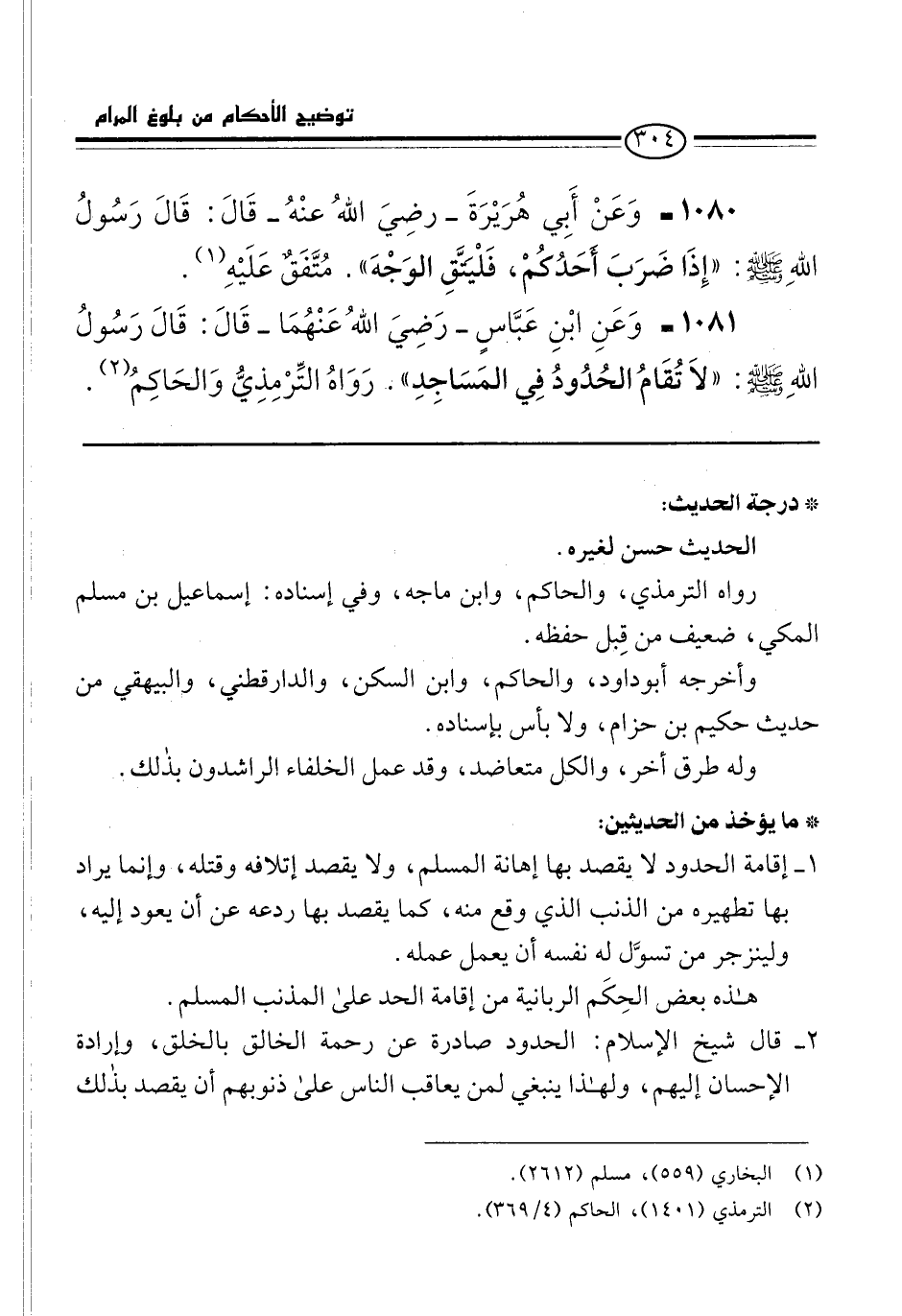 1081 - وَعَنِ ابْنِ عَبَّاسٍ -رَضِيَ اللهُ عَنْهُمَا- قَالَ: قَالَ رَسُولُ اللهِ -صلى الله عليه وسلم-: "لاَ تُقَامُ الحُدُودُ فِي المَسَاجِدِ". رَوَاهُ التِّرْمِذِيُّ وَالحَاكِمُ (¬2).