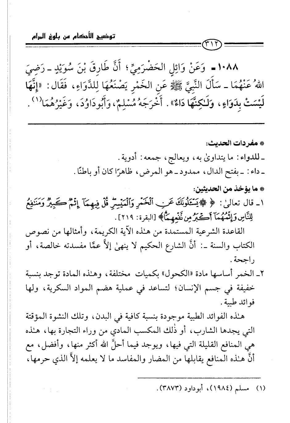 1088 - وَعَنْ وَائِلٍ الحَضْرَمِيِّ، أَنَّ طَارِقَ بْنَ سُوَيْدٍ -رَضِيَ اللهُ عَنْهُمَا- سَأَلَ النَّبِيَّ -صلى الله عليه وسلم- عَنِ الخَمْرِ يَصْنَعُهَا لِلدَّوَاءِ، فَقَال: "إِنَّهَا لَيْسَتْ بِدَوَاءٍ، وَلَكِنَّهَا دَاءٌ". أَخْرَجَهُ مُسْلِمٌ، وَأَبُو دَاوُدَ، وَغَيْرُهُمَا (¬1).