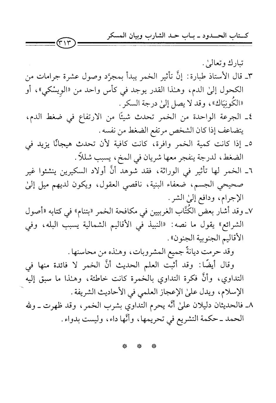 3 - قال الأستاذ طبارة: إنَّ تأثير الخمر يبدأ بمجرَّد وصول عشرة جرامات من الكحول إلى الدم، وهذا القدر يوجد في كأس واحد من "الوِيسْكي"، أو "الكُونيَاك"، وقد لا يصل إلى درجة السكر.