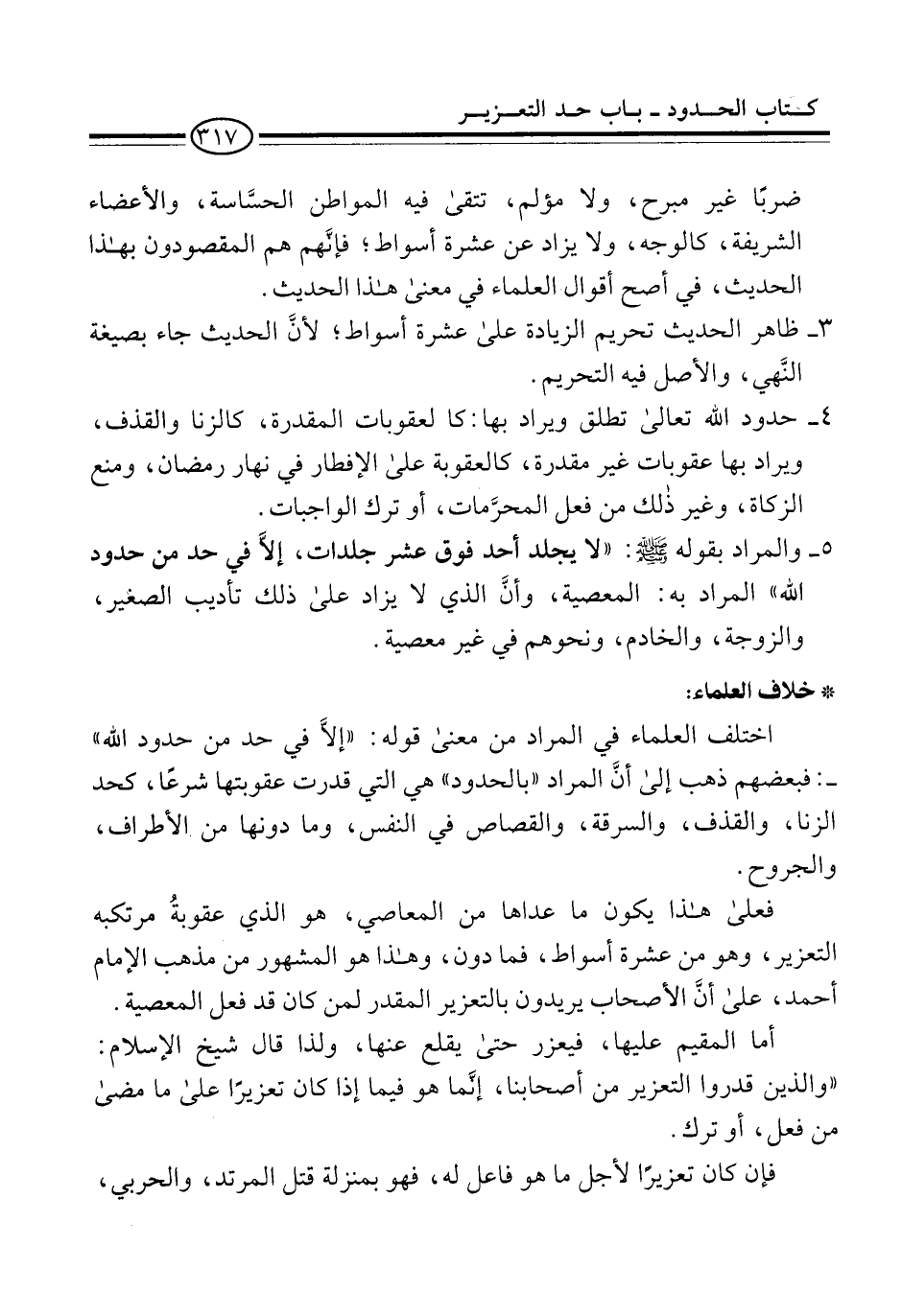 5 - والمراد بقوله -صلى الله عليه وسلم-: "لا يجلد أحد فوق عشر جلدات، إلاَّ في حد من حدود الله" المراد به: المعصية، وأنَّ الذي لا يزاد على ذلك تأديب الصغير، والزوجة، والخادم، ونحوهم في غير معصية.