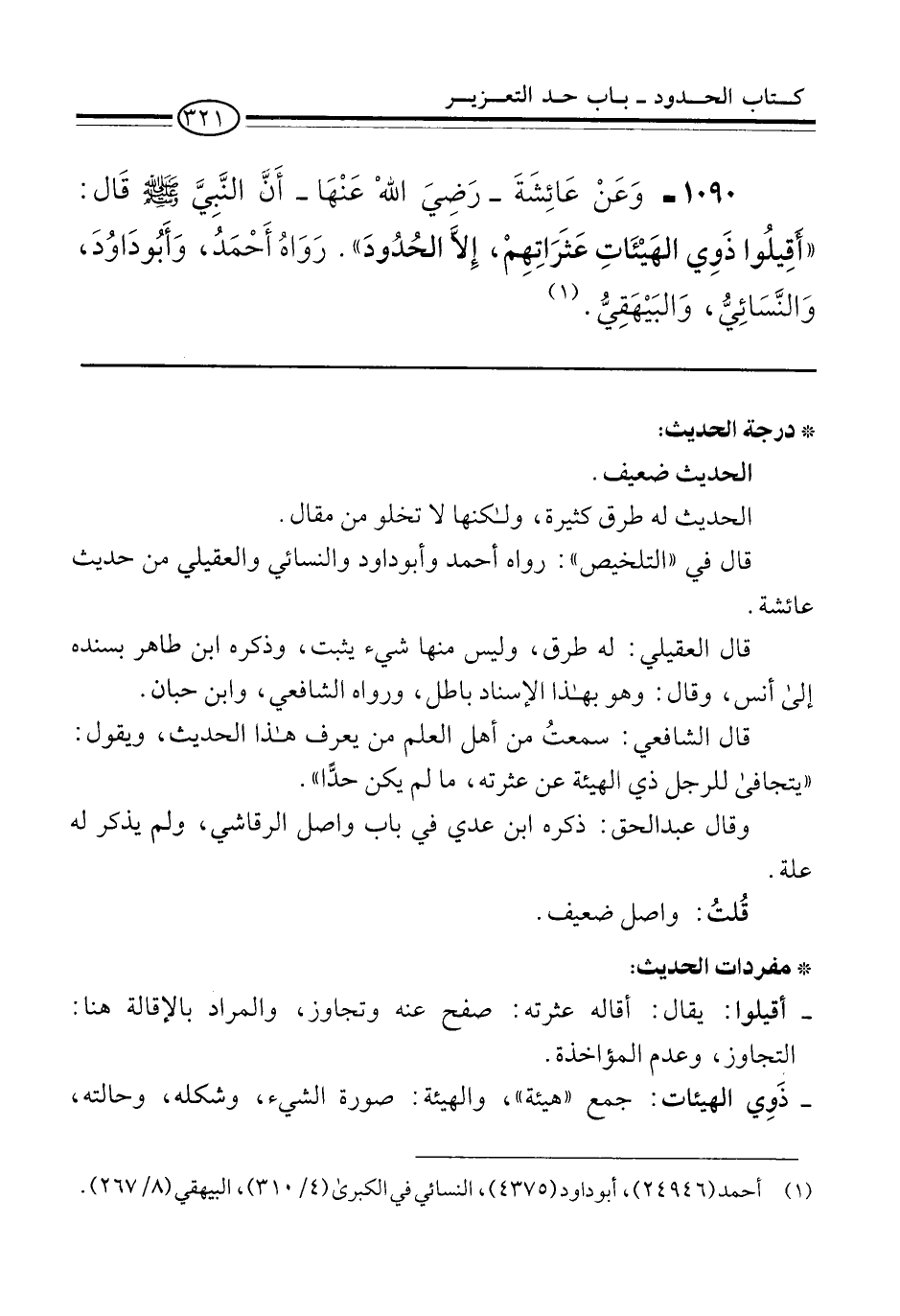 1090 - وَعَنْ عَائِشَةَ -رَضِيَ الله عَنْهَا- أَن النَّبِيَّ -صلى الله عليه وسلم- قال: "أَقِيلُوا ذَوِي الهَيْئَاتِ عَثَرَاتِهِمْ، إِلاَّ الحُدُودَ". رَوَاه أَحْمَدُ، وَأَبُو دَاوُدَ، وَالنَّسَائِيُّ، وَالبَيْهَقِيُّ. (¬1)