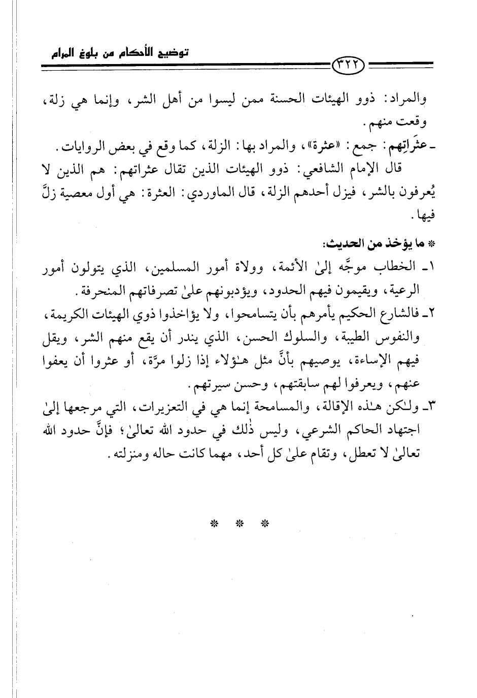 2 - فالشارع الحكيم يأمرهم بأن يتسامحوا، ولا يؤاخذوا ذوي الهيئات الكريمة، والنفوس الطيبة، والسلوك الحسن، الذي يندر أن يقع منهم الشر، ويقل فيهم الإساءة، يوصيهم بأنَّ مثل هؤلاء إذا زلوا مرَّة، أو عثروا أن يعفوا عنهم، ويعرفوا لهم سابقتهم، وحسن سيرتهم.