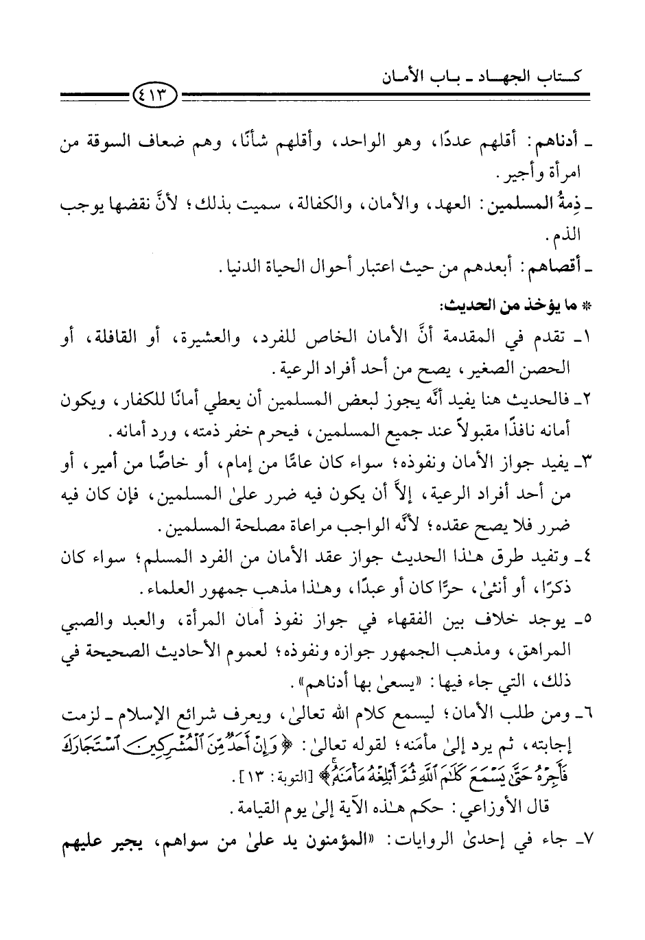 6 - ومن طلب الأمان؛ ليسمع كلام الله تعالى، ويعرف شرائع الإسلام -لزمت إجابته، ثم يرد إلى مأمَنه؛ لقوله تعالى: {وَإِنْ أَحَدٌ مِنَ الْمُشْرِكِينَ اسْتَجَارَكَ فَأَجِرْهُ حَتَّى يَسْمَعَ كَلَامَ اللَّهِ ثُمَّ أَبْلِغْهُ مَأْمَنَهُ} [التوبة: 6].