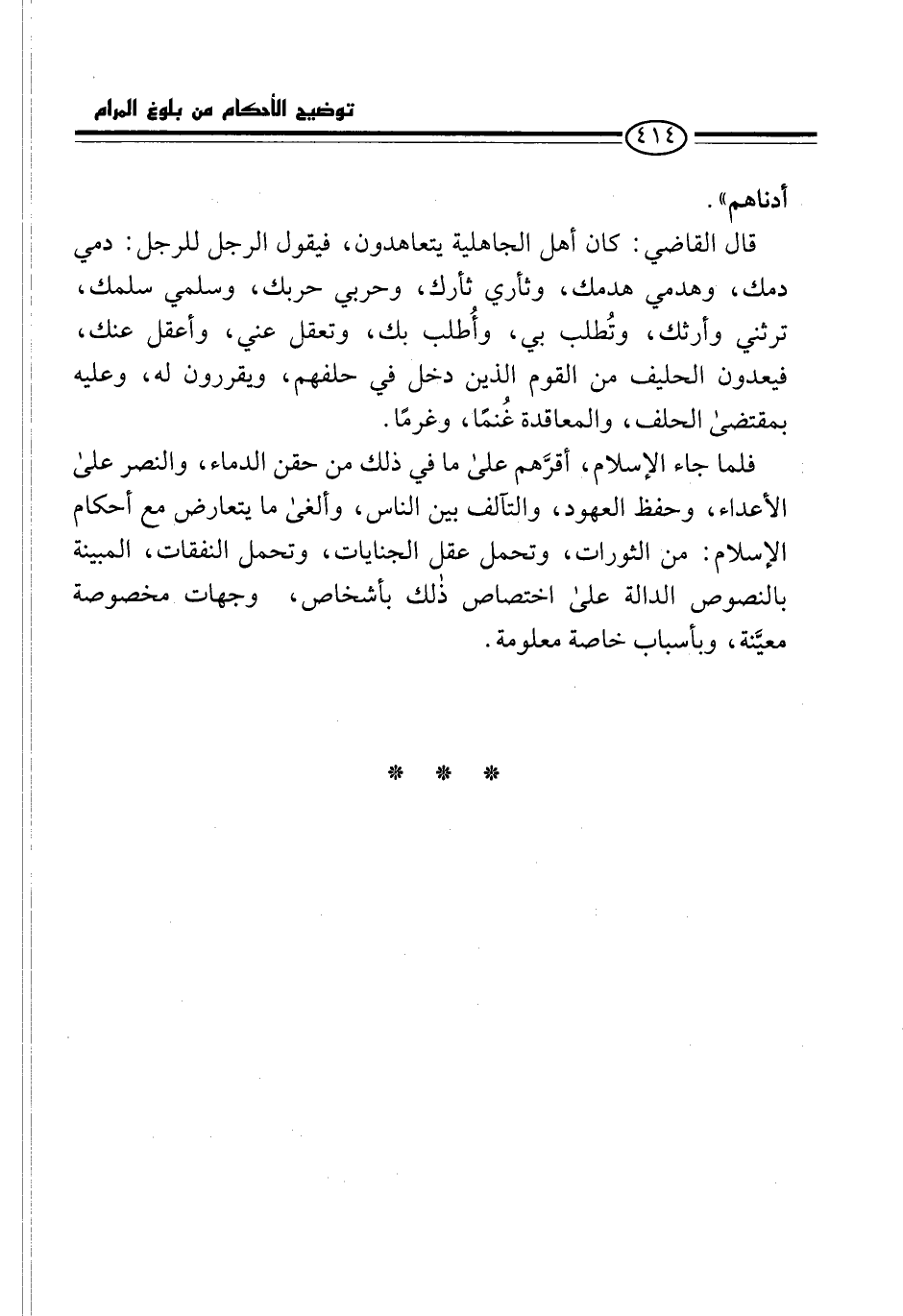 فلما جاء الإسلام، أقرَّهم على ما في ذلك من حقن الدماء، والنصر على الأعداء، وحفظ العهود، والتآلف بين الناس، وألغى ما يتعارض مع أحكام الإسلام: من الثورات، وتحمل عقل الجنايات، وتحمل النفقات، المبينة بالنصوص الدالة على اختصاص ذلك بأشخاص، وجهات مخصوصة معيَّنة، وبأسباب خاصة معلومة.