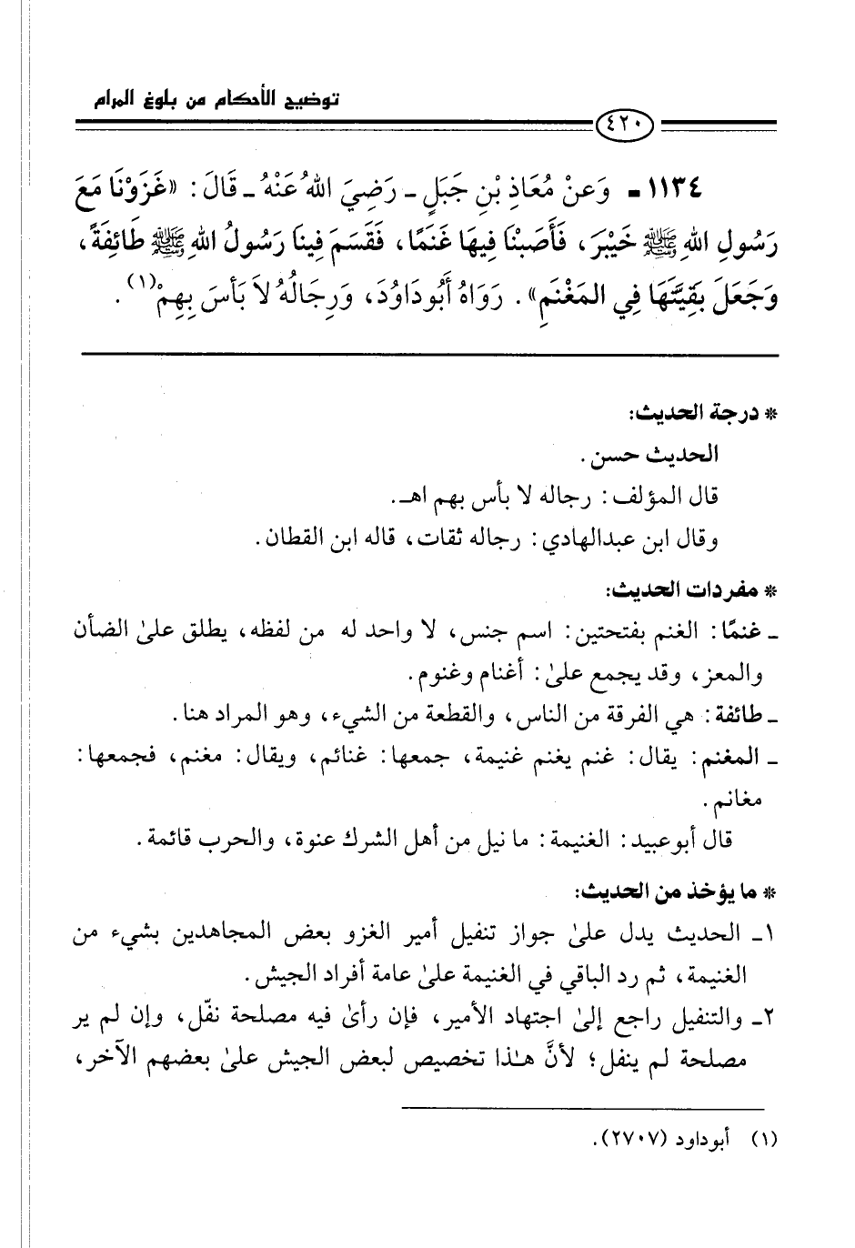1134 - وَعنْ مُعَاذِ بْنِ جَبَلٍ -رَضِيَ اللهُ عَنْهُ- قَالَ: "غَزَوْنَا مَعَ رَسُولِ اللهِ -صلى الله عليه وسلم- خَيْبرَ، فَأَصَبْنَا فِيهَا غَنَمًا، فَقَسَمَ فِينَا رَسُولُ اللهِ -صلى الله عليه وسلم- طَائِفَةً، وَجَعَلَ بقِيَّتَهَا فِي المَغْنَمِ". رَوَاهُ أَبُو دَاوُدَ، وَرِجَالُهُ لاَ بَأسَ بِهِمْ (¬1).