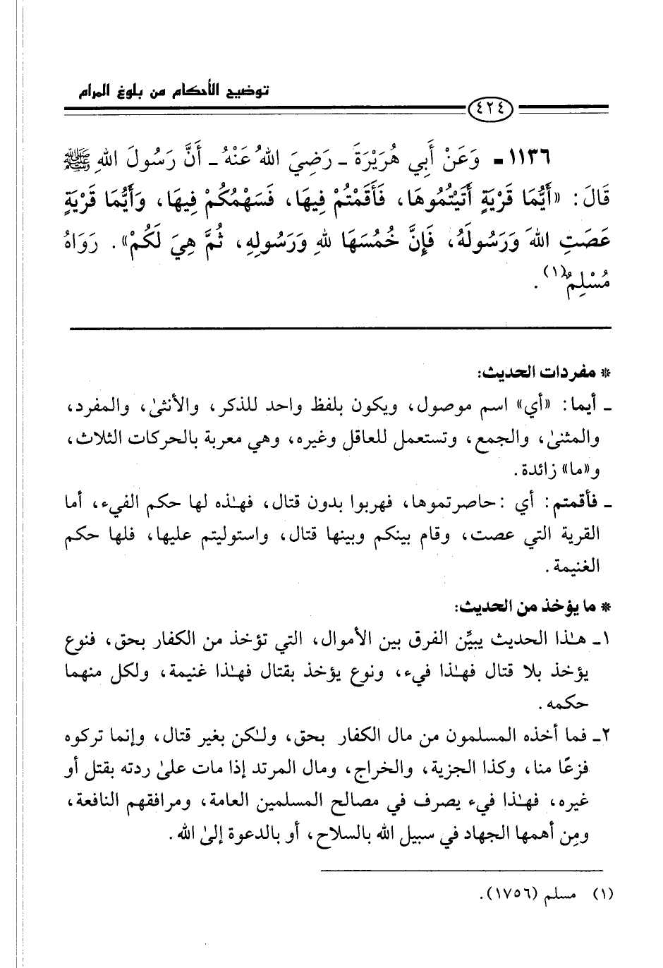 1136 - وَعَنْ أَبِي هُرَيْرَةَ -رَضِيَ اللهُ عَنْهُ- أَنَّ رَسُولَ اللهِ -صلى الله عليه وسلم- قَالَ: "أَيُّمَا قَرْيةٍ أَتَيْتُمُوهَا، فَأَقَمْتُمْ فِيهَا، فَسَهْمُكُمْ فِيهَا، وَأَيُّمَا قَرْيةٍ عَصَتِ اللهَ وَرَسُولَهُ، فَإنَّ خُمُسَهَا للهِ وَرَسُولِهِ، ثُمَّ هِيَ لَكُمْ". رَوَاهُ مُسْلِمٌ (¬1).