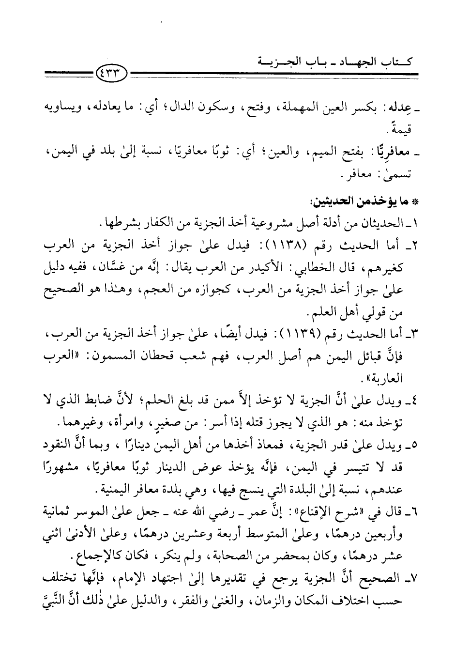 3 - أما الحديث رقم (1139): فيدل أيضًا، على جواز أخذ الجزية من العرب، فإنَّ قبائل اليمن هم أصل العرب، فهم شعب قحطان المسمون: "العرب العاربة".