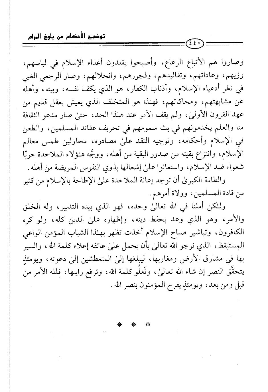 وصاروا هم الأتباع الرعاع، وأصبحوا يقلدون أعداء الإسلام في لباسهم، وزيهم، وعاداتهم، وتقاليدهم، وفجورهم، وانحلالهم، وصار الرجعي الغبي في نظر أدعياء الإسلام، وأذناب الكفار، هو الذي يكف نفسه، وبيته، وأهله عن مشابهتهم، ومحاكاتهم، فهذا هو المتخلف الذي يعيش بعقل قديم من عهد القرون الأولى، ولم يقف الأمر عند هذا الحد، حتى صار مدعو الثقافة منا والعلم يخدمونهم في بث سمومهم في تحريف عقائد المسلمين، والطعن في الإسلام وأحكامه، وتوجيه النقد على مصادره، محاولين طمس معالم الإسلام، وانتزاع بقيته من صدور البقية من أهله، ووجَّه هؤلاء الملاحدة حربًا شعواء ضد الإسلام، واستعانوا على إشعالها بذوي النفوس المريضة من أهله.