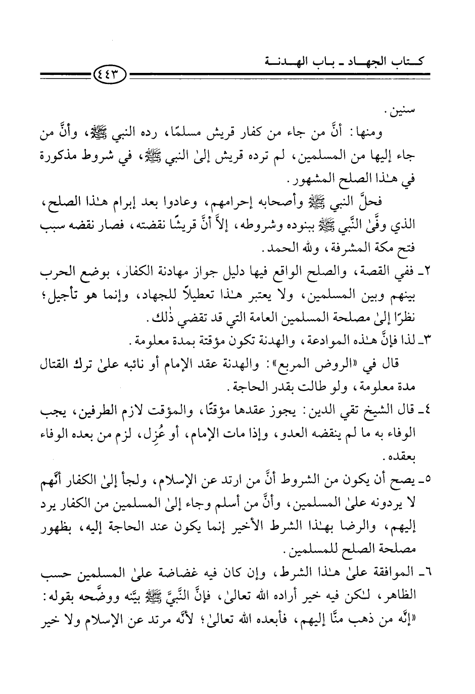 5 - يصح أن يكون من الشروط أنَّ من ارتد عن الإسلام، ولجأ إلى الكفار أنَّهم لا يردونه على المسلمين، وأنَّ من أسلم وجاء إلى المسلمين من الكفار يرد إليهم، والرضا بهذا الشرط الأخير إنما يكون عند الحاجة إليه، بظهور مصلحة الصلح للمسلمين.