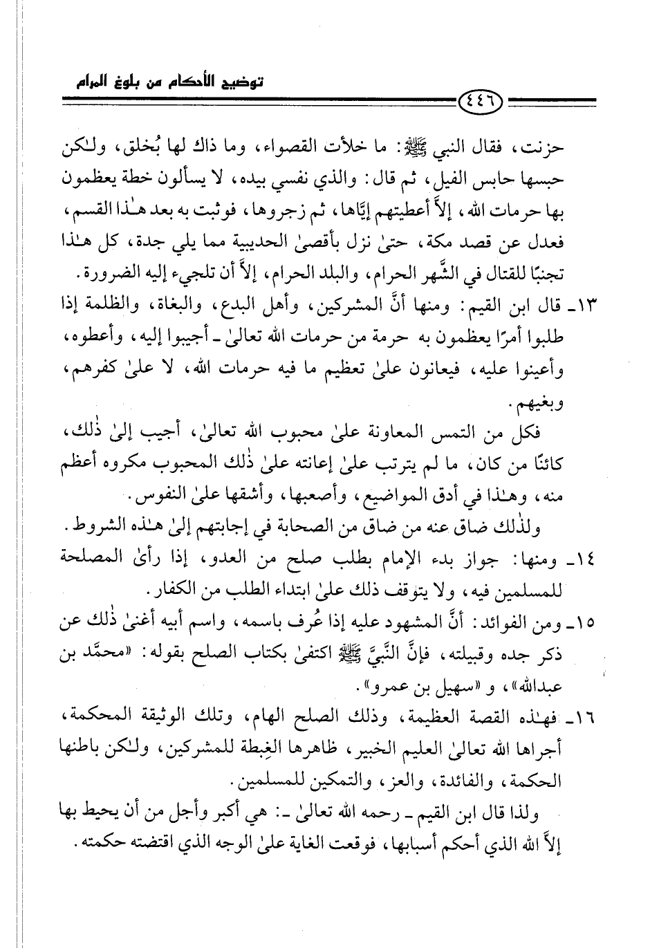 15 - ومن الفوائد: أنَّ المشهود عليه إذا عُرف باسمه، واسم أبيه أغنى ذلك عن ذكر جده وقبيلته، فإنَّ النَّبيَّ -صلى الله عليه وسلم- اكتفى بكتاب الصلح بقوله: "محمَّد بن عبد الله"، و"سهيل بن عمرو".