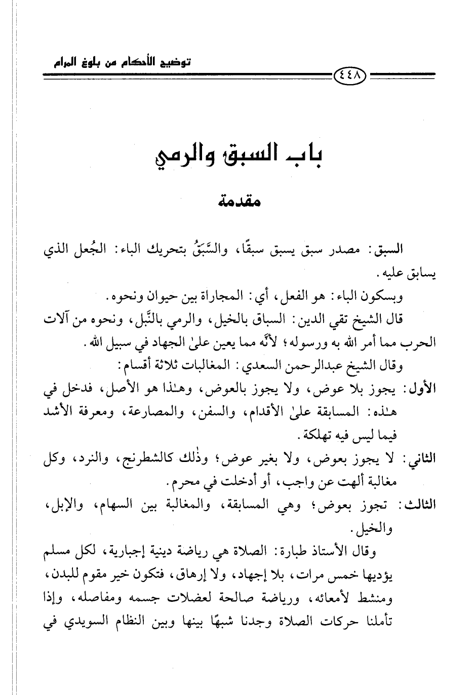 قال الشيخ تقي الدين: السباق بالخيل، والرمي بالنَّبل، ونحوه من آلات الحرب مما أمر الله به ورسوله؛ لأنَّه مما يعين على الجهاد في سبيل الله.