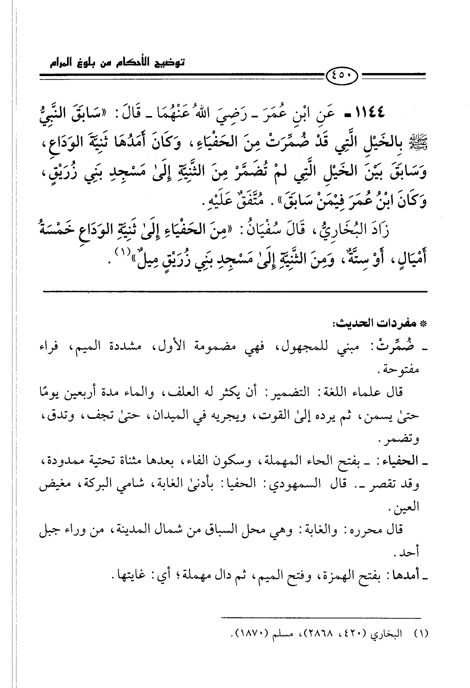 1144 - عَنِ ابْنِ عُمَرَ -رَضِيَ اللهُ عَنْهُمَا- قَالَ: "سَابَقَ النَّبِيُّ -صلى الله عليه وسلم- بِالخَيْلِ الَّتِي قَدْ ضُمِّرَتْ مِنَ الحَفْيَاءِ، وَكانَ أَمَدُهَا ثَنِيَّةَ الوَدَاعِ، وَسَابَقَ بَيْنَ الخَيْلِ الَّتِي لمْ تُضَمَّرْ مِنَ الثَّنِيَّةِ إِلَى مَسْجِدِ بنَي زُرَيْقٍ، وَكانَ ابْنُ عُمَرَ فِيْمَنْ سَابَقَ". مُتَّفَقٌ عَلَيْهِ.