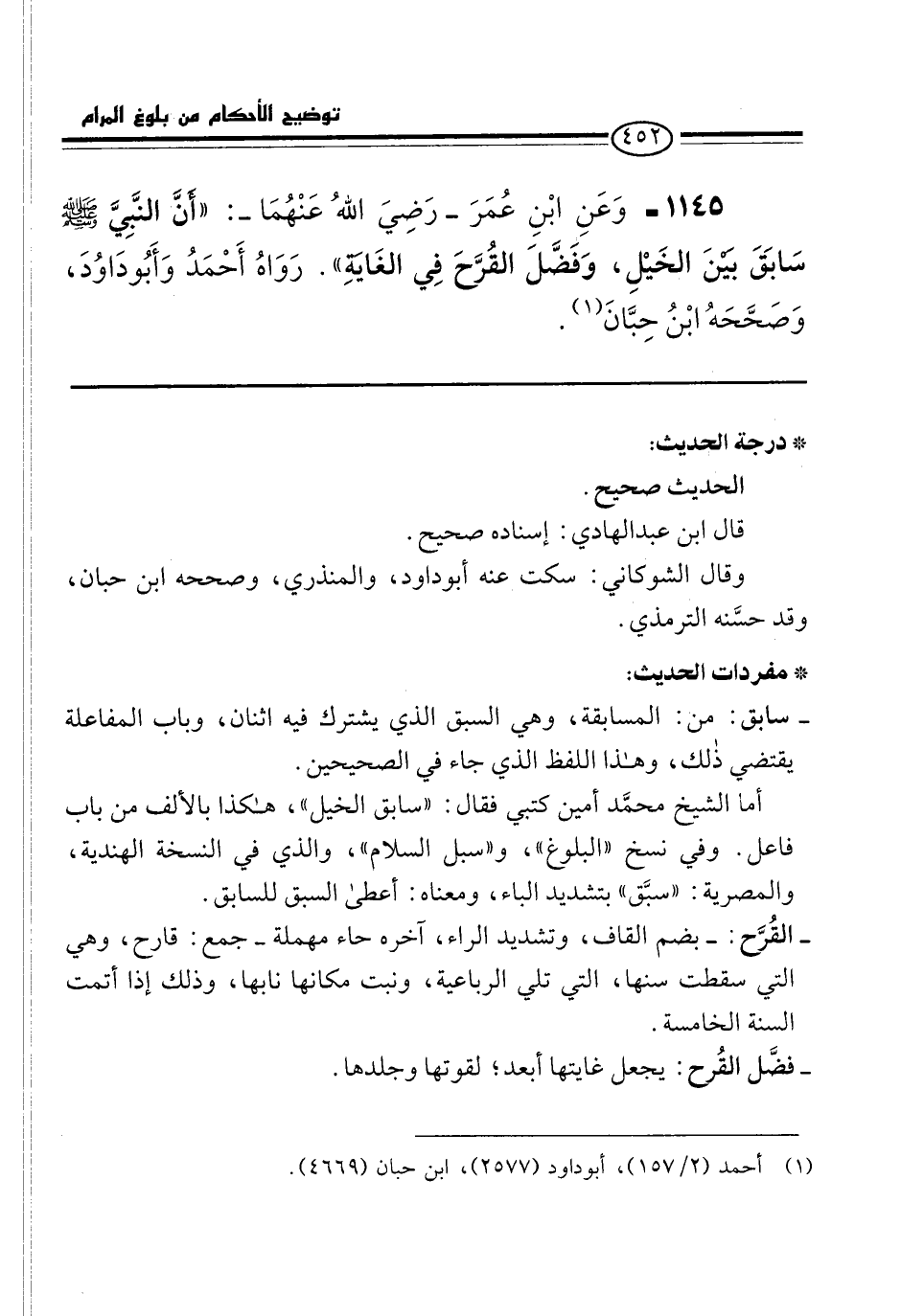 1145 - وَعَنِ ابْنِ عُمَرَ -رَضِيَ اللهُ عَنْهُمَا-: "أنَّ النَّبِيَّ -صلى الله عليه وسلم- سَابَقَ بَيْنَ الخَيْلِ، وَفَضَّلَ القُرَّحَ فِي الغَايَةِ". رَوَاهُ أَحْمَدُ وَأَبُو دَاوُدَ، وَصَحَّحَهُ ابْنُ حِبَّانَ (¬1).