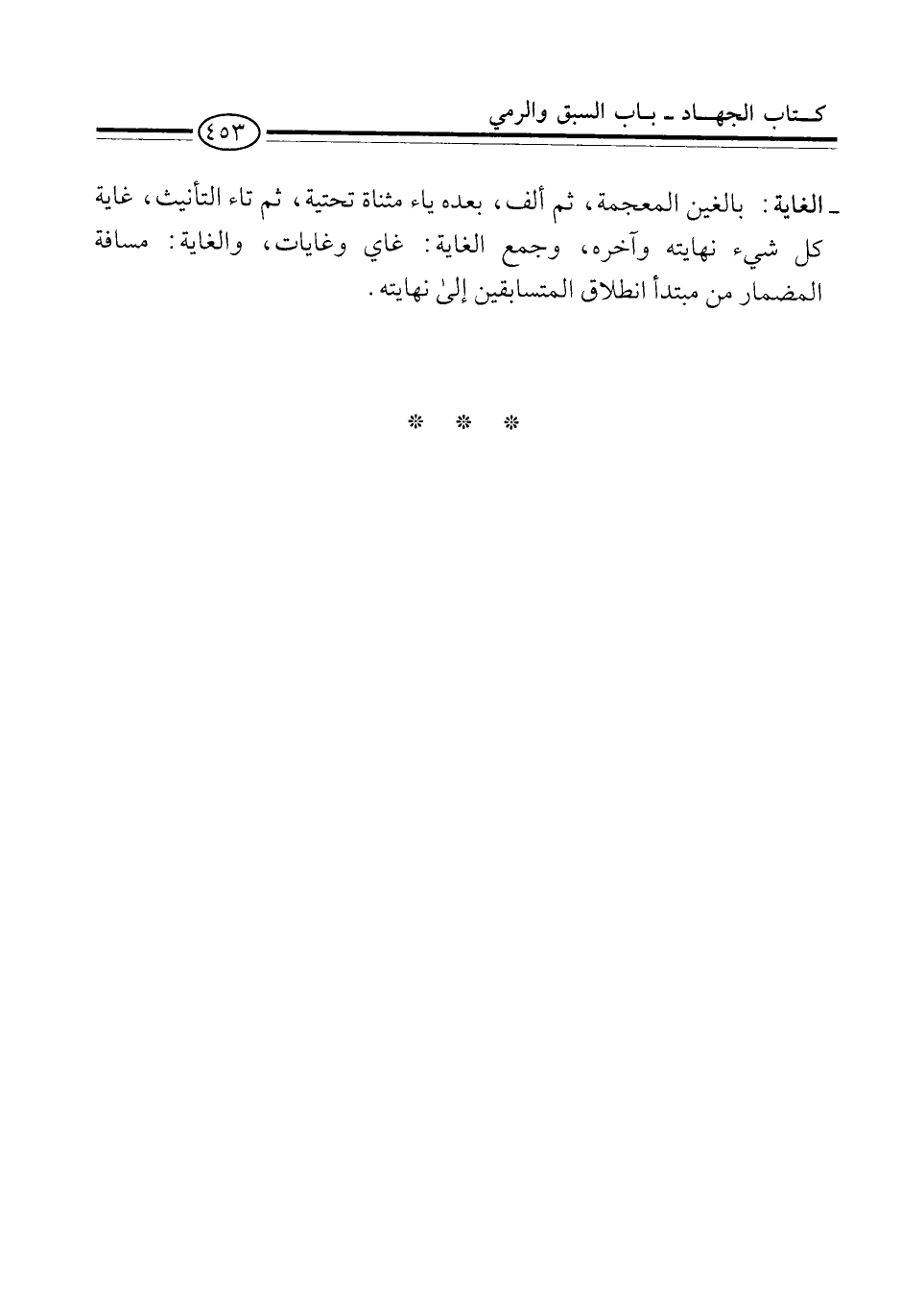 - الغاية: بالغين المعجمة، ثم ألف، بعده ياء مثناة تحتية، ثم تاء التأنيث، غاية كل شيء نهايته وآخره، وجمع الغاية: غاي وغايات، والغاية: مسافة المضمار من مبتدأ انطلاق المتسابقين إلى نهايته.
