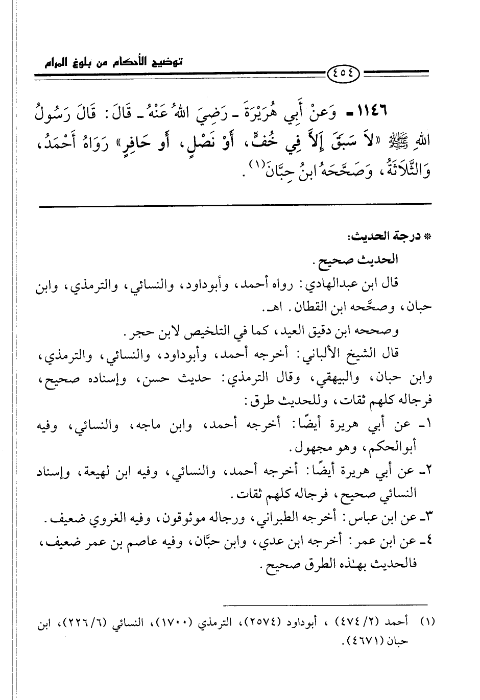 1146 - وَعنْ أَبِي هُرَيْرَةَ -رَضِيَ اللهُ عَنْهُ- قَالَ: قَالَ رَسُولُ اللهِ -صلى الله عليه وسلم- "لاَ سَبَقَ إِلاَّ فِي خُفٍّ، أوْ نَصْلٍ، أو حَافِرٍ" رَوَاهُ أَحْمَدُ، وَالثَّلاَثَةُ، وَصَحَّحَهُ ابنُ حِبَّانَ (¬1).