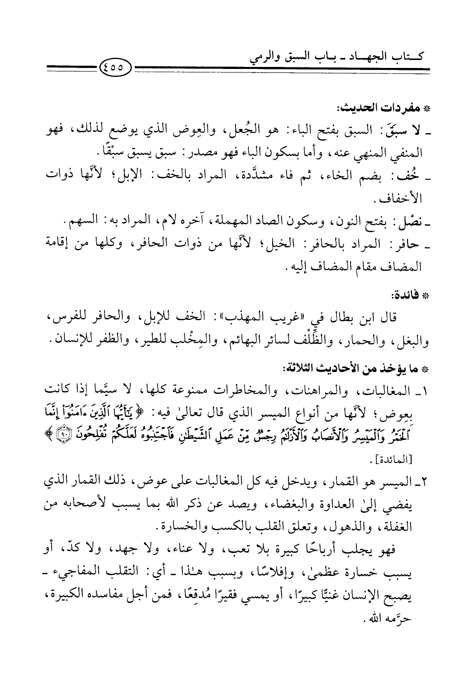 - لا سبَقَ: السبق بفتح الباء: هو الجُعل، والعِوض الذي يوضع لذلك، فهو المنفي المنهي عنه، وأما بسكون الباء فهو مصدر: سبق يسبق سبْقًا.