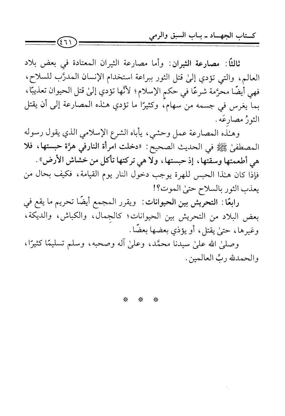 ثالثًا: مصارعة الثيران: وأما مصارعة الثيران المعتادة في بعض بلاد العالم، والتي تؤدي إلى قتل الثور ببراعة استخدام الإنسان المدرَّب للسلاح، فهي أيضًا محرَّمة شرعًا في حكمِ الإسلام؛ لأنَّها تؤدي إلى قتل الحيوان تعذيبًا، بما يغرس في جسمه من سهام، وكثيرًا ما تؤدي هذه المصارعة إلى أن يقتل الثورُ مصارِعَه.