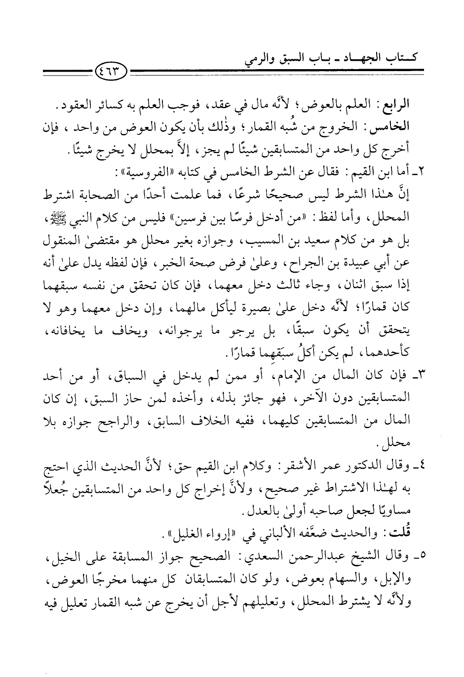 4 - وقال الدكتور عمر الأشقر: وكلام ابن القيم حق؛ لأنَّ الحديث الذي احتج به لهذا الاشتراط غير صحيح، ولأنَّ إخراج كل واحد من المتسابقين جُعلاً مساويًا لجعل صاحبه أولى بالعدل.