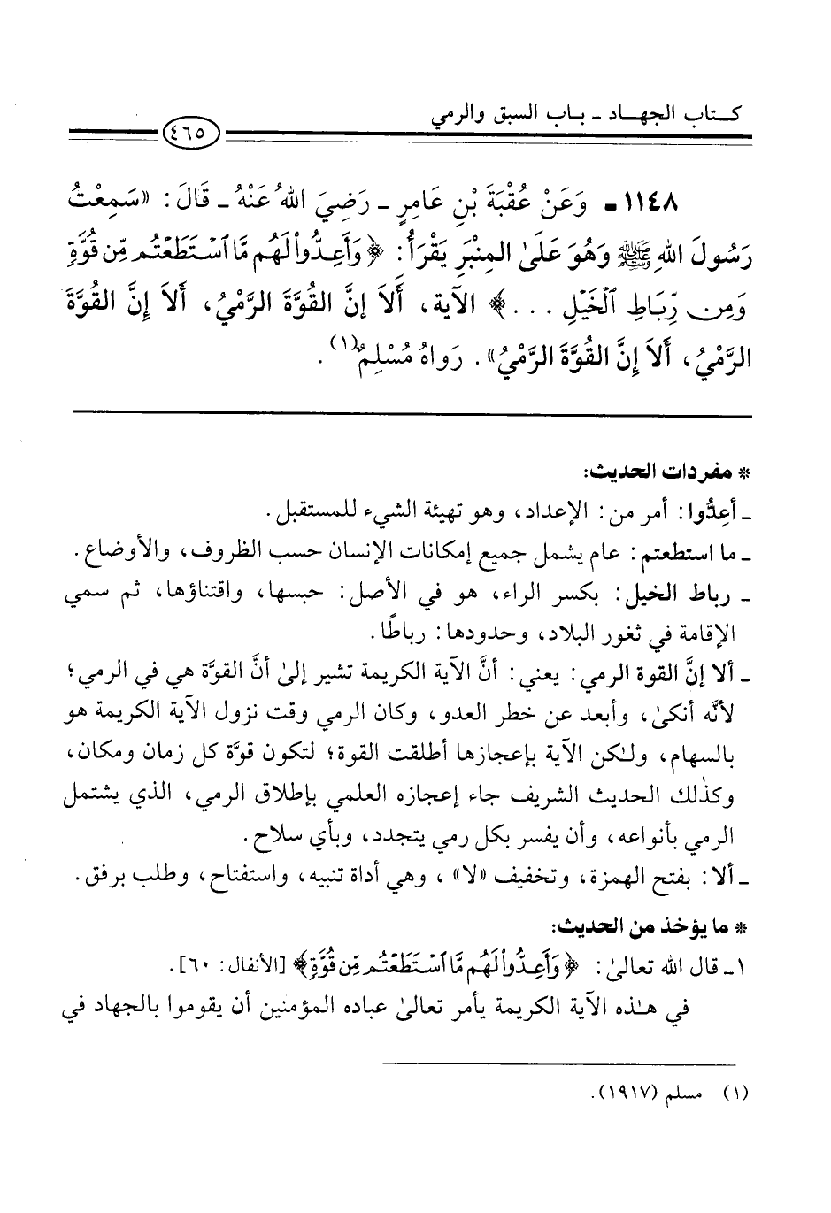 1148 - وَعَنْ عُقْبَةَ بْنِ عَامِرٍ -رَضِيَ اللهُ عَنْهُ- قَالَ: "سَمِعْتُ رَسُولَ اللهِ -صلى الله عليه وسلم- وهُوَ عَلَى المِنْبَرِ يَقْرَأُ: {وَأَعِدُّوا لَهُمْ مَا اسْتَطَعْتُمْ مِنْ قُوَّةٍ وَمِنْ رِبَاطِ الْخَيْلِ ...} الآية، أَلاَ إنَّ القُوَّةَ الرَّمْيُ، أَلاَ إِن القُوَّةَ الرَّمْيُ، أَلاَ إِنَّ القُوَّةَ الرَّمْيُ". رَواهُ مُسْلِمٌ (¬1).