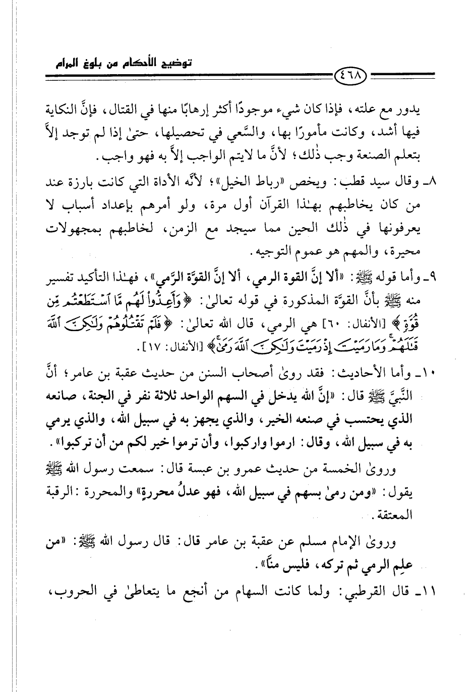 9 - وأما قوله -صلى الله عليه وسلم-: "ألا إنَّ القوة الرمي، ألا إنَّ القوَّة الرَّمي"، فهذا التأكيد تفسير منه -صلى الله عليه وسلم- بأنَّ القوَّة المذكورة في قوله تعالى: {وَأَعِدُّوا لَهُمْ مَا اسْتَطَعْتُمْ مِنْ قُوَّةٍ} [الأنفال: 60] هي الرمي، قال الله تعالى: {فَلَمْ تَقْتُلُوهُمْ وَلَكِنَّ اللَّهَ قَتَلَهُمْ وَمَا رَمَيْتَ إِذْ رَمَيْتَ وَلَكِنَّ اللَّهَ رَمَى} [الأنفال: 17].
