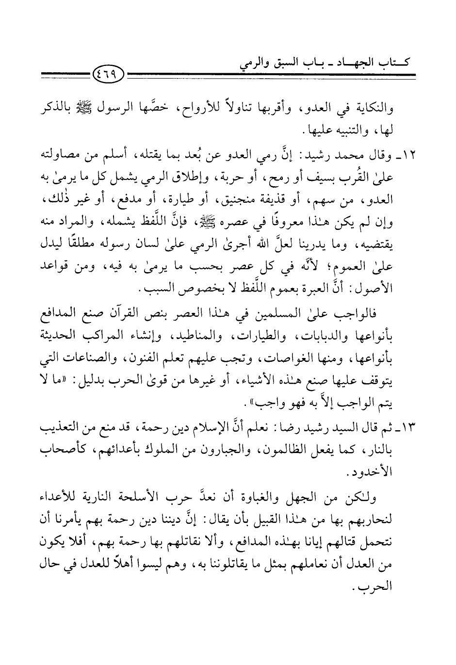 12 - وقال محمَّد رشيد: إنَّ رمي العدو عن بُعد بما يقتله، أسلم من مصاولته على القُرب بسيف أو رمح، أو حربة، وإطلاق الرمي يشمل كل ما يرمى به العدو، من سهم، أو قذيفة منجنيق، أو طيارة، أو مدفع، أو غير ذلك، وإن لم يكن هذا معروفًا في عصره -صلى الله عليه وسلم-، فإنَّ اللفظ يشمله، والمراد منه يقتضيه، وما يدرينا لعلَّ الله أجرى الرمي على لسان رسوله مطلقًا ليدل على العموم؛ لأنَّه في كل عصر بحسب ما يرمى به فيه، ومن قواعد الأصول: أنَّ العبرة بعموم اللَّفظ لا بخصوص السبب.