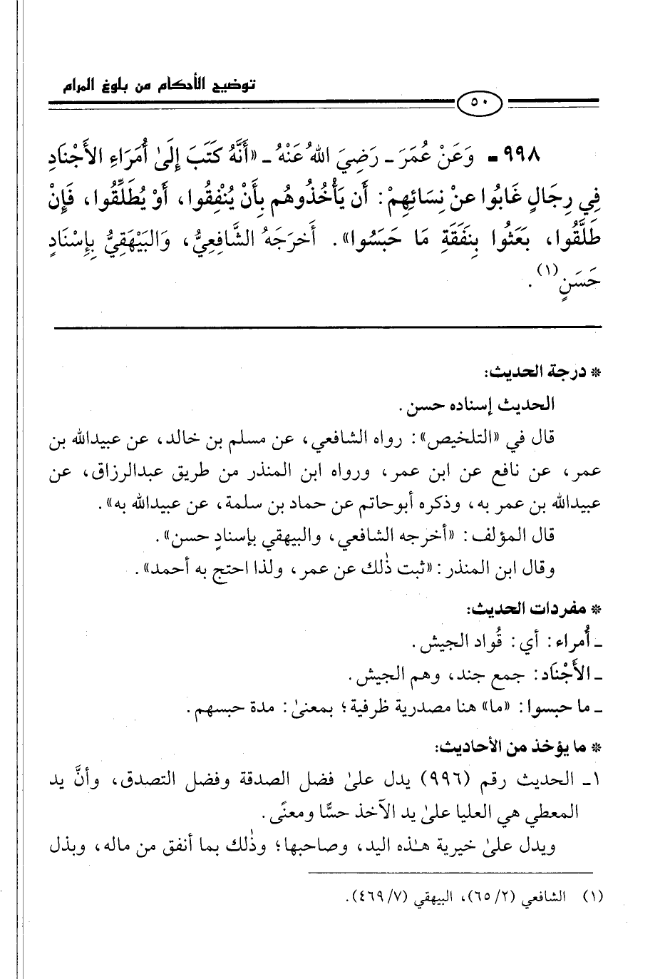 988 - وَعَنْ عُمَرَ -رَضِيَ اللهُ عَنْهُ- "أَنَّهُ كَتَبَ إلى أُمَرَاءِ الأَجْنادِ فِي رِجَالٍ غَابُوا عنْ نِسَائِهِمْ: أَن يأْخُذُوهُم بِأَنْ يُنْفِقُوا، أوْ يُطَلِّقُوا، فَإنْ طَلَّقُوا، بَعَثُوا بِنَفَقَةِ مَما حَبَسُوا". أَخرَجَهُ الشَّافِعِيُّ، وَالبَيْهَقِيُّ بِإِسْنَادٍ حَسَنٍ (¬1).