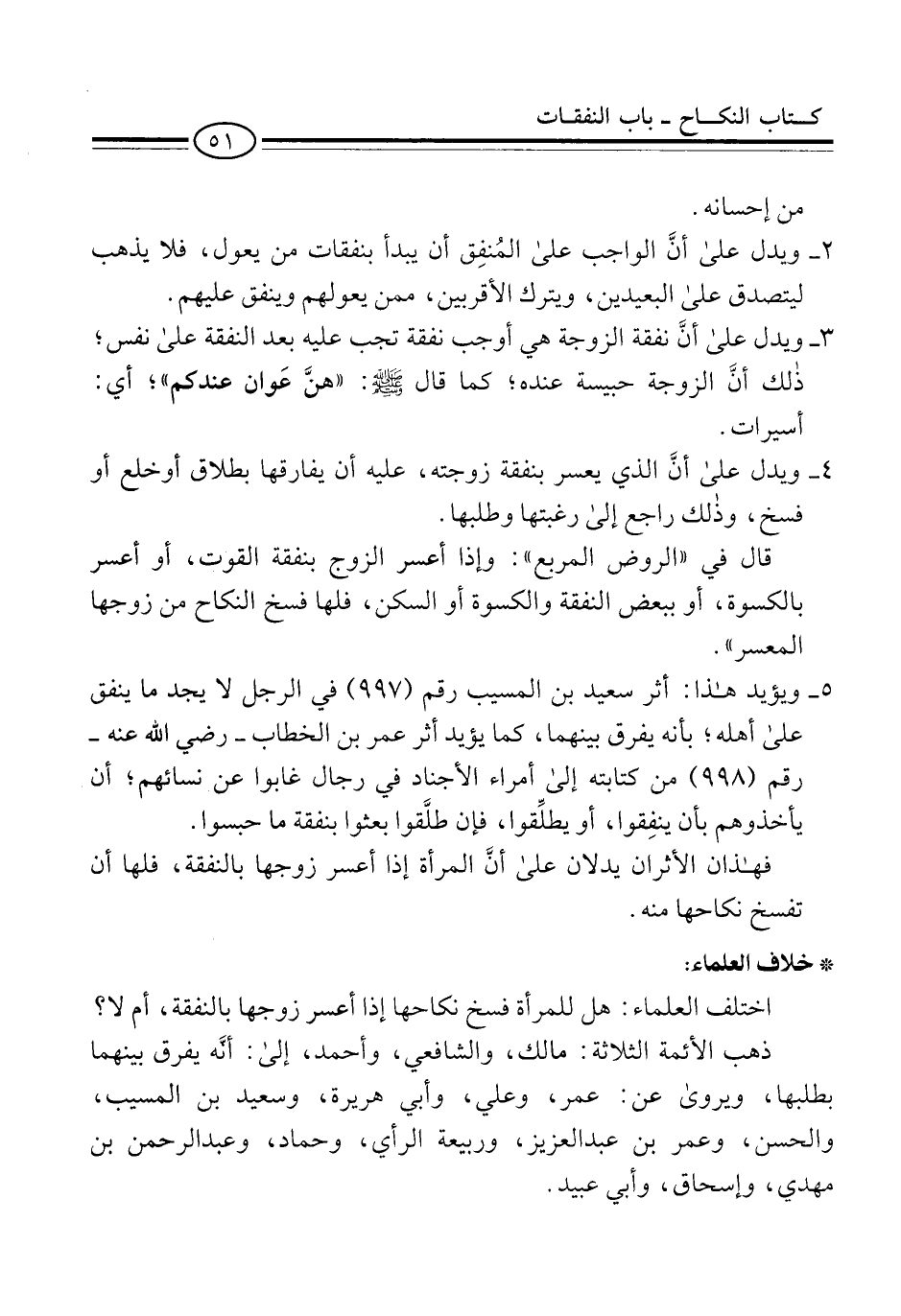5 - ويؤيد هذا: أثر سعيد بن المسيب رقم (997) في الرجل لا يجد ما ينفق على أهله؛ بأنه يفرق بينهما، كما يؤيد أثر عمر بن الخطاب -رضي الله عنه- رقم (998) من كتابته إلى أمراء الأجناد في رجال غابوا عن نسائهم؛ أن يأخذوهم بأن ينفِقوا، أو يطلِّقوا، فإن طلَّقوا بعثوا بنفقة ما حبسوا.