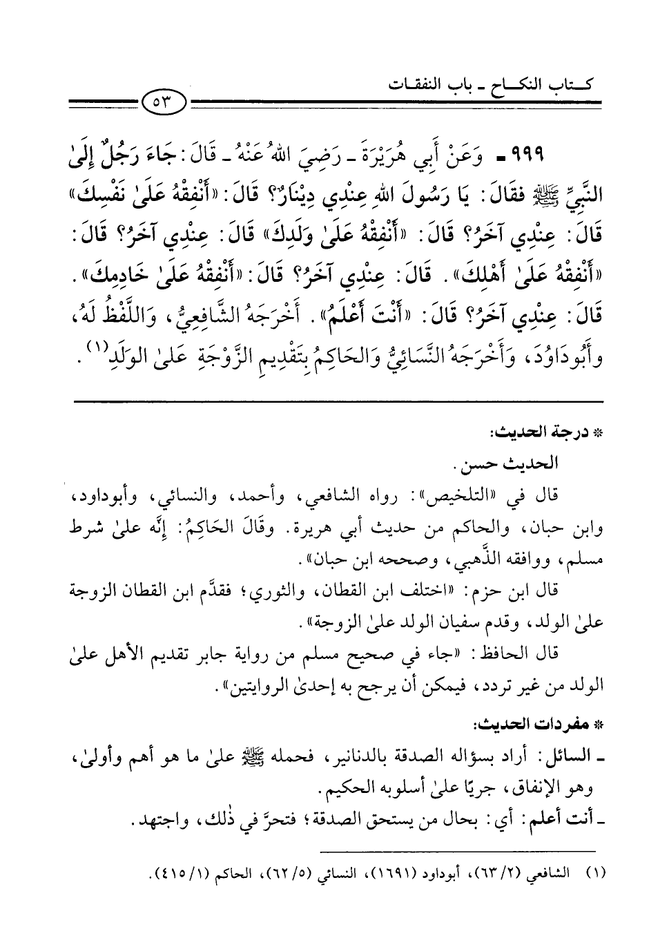 999 - وَعَنْ أِبي هُرَيْرَةَ -رَضِيَ اللهُ عَنْهُ- قَالَ: جَاءَ رَجُلٌ إِلَى النَّبيِّ -صلى الله عليه وسلم- فقَالَ: يَا رَسُولَ اللهِ عِنْدِي دِيْنارٌ؟ قَالَ: "أَنْفِقْهُ عَلَى نَفْسِكَ" قَالَ: عِنْدِي آخَرُ؟ قَالَ: "أنْفِقْهُ عَلى وَلَدِكَ" قَالَ: عِنْدِي آخَرُ؟ قَالَ: "أنْفِقْهُ عَلَى أهْلِكَ". قَالَ: عِنْدِي آخَرُ؟ قَالَ: "أنْفِقْهُ عَلَى خَادمِكَ". قَالَ: عِنْدِي آخَرُ؟ قَالَ: "أنْتَ أَعْلَمُ". أَخْرَجَهُ الشَّافِعِيُّ، وَاللَّفْظُ لَهُ، وأَبُو دَاوُدَ، وَأَخْرَجَهُ النَّسَائِيُّ وَالحَاكِمُ بِتَقْدِيمِ الزَّوْجَةِ عَلى الوَلَدِ (¬1).