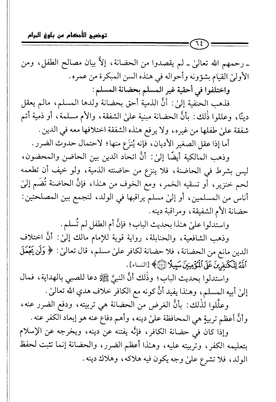 -رحمهم الله تعالى- لم يقصدوا من الحضانة، إلاَّ بيان مصالح الطفل، ومن الأولى القيام بشؤونه وأحواله في هذه السن المبكرة من عمره.