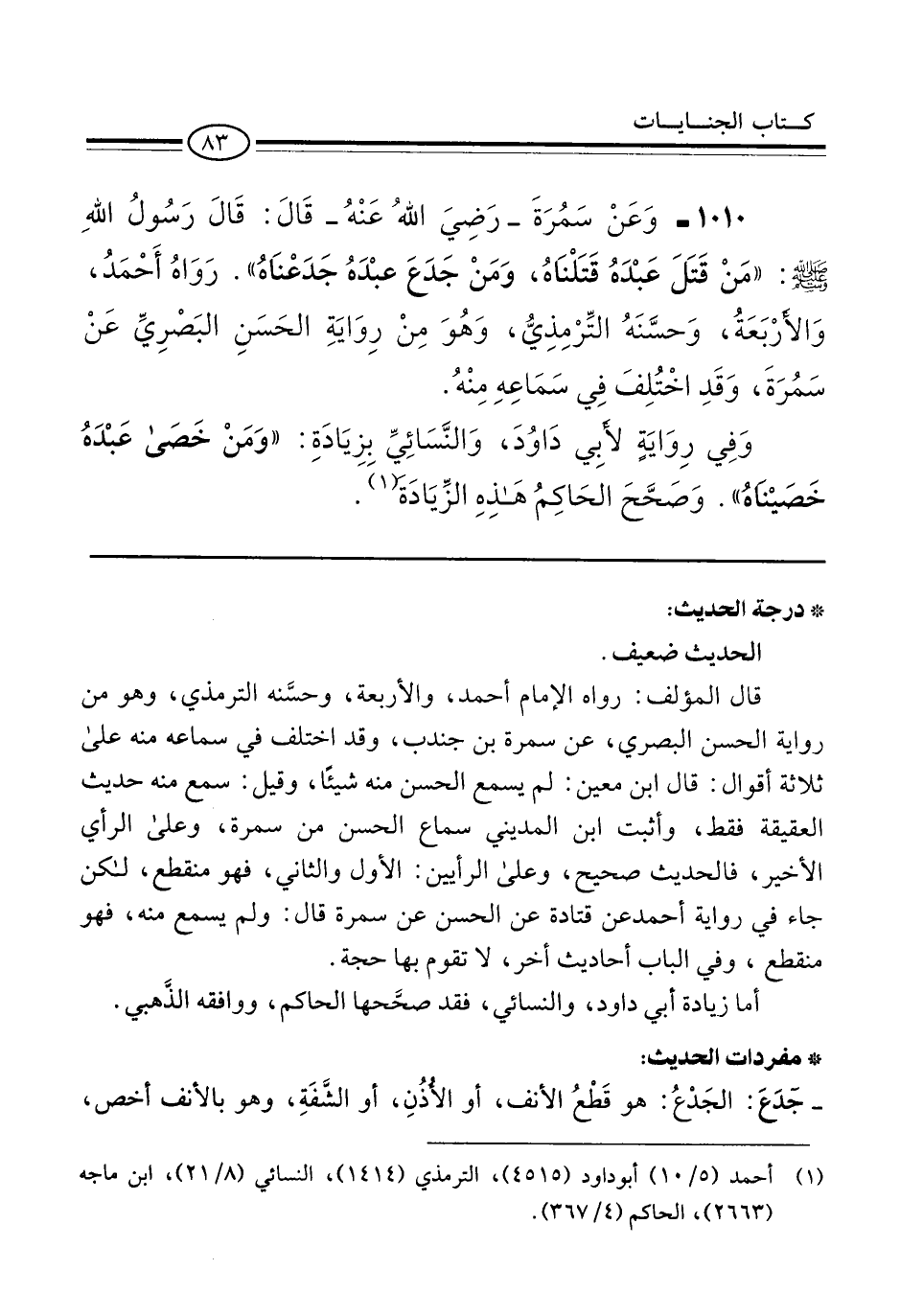 1010 - وَعَنْ سَمُرَةَ -رَضِيَ اللهُ عَنْهُ- قَالَ: قَالَ رَسُولُ اللهِ -صلى الله عليه وسلم-: "مَنْ قَتَلَ عَبْدَهُ قَتَلْنَاهُ، وَمَنْ جَدَعَ عبْدَهُ جَدَعْنَاهُ". رَوَاهُ أَحْمَدُ، وَالأَرْبَعَةُ، وَحسَّنَهُ التِّرْمِذِيُّ، وَهُوَ مِنْ رِوَايَةِ الحَسَنِ البَصْرِيِّ عَنْ سَمُرَةَ، وَقَدِ اخْتُلِفَ فِي سَمَاعِهِ مِنْهُ.