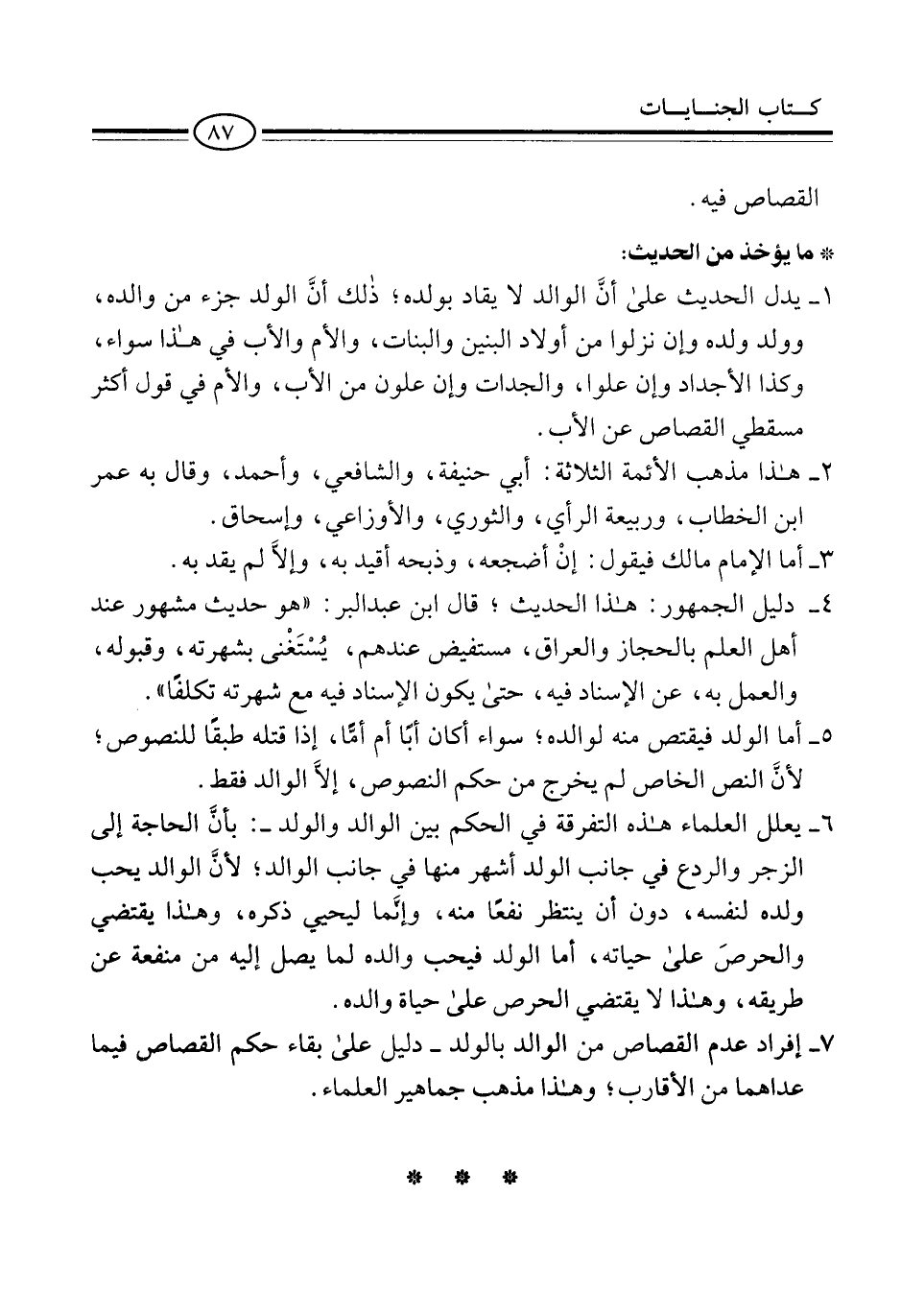 5 - أما الولد فيقتص منه لوالده؛ سواء أكان أبًا أم أمًّا، إذا قتله طبقًا للنصوص؛ لأنَّ النص الخاص لم يخرج من حكم النصوص، إلاَّ الوالد فقط.