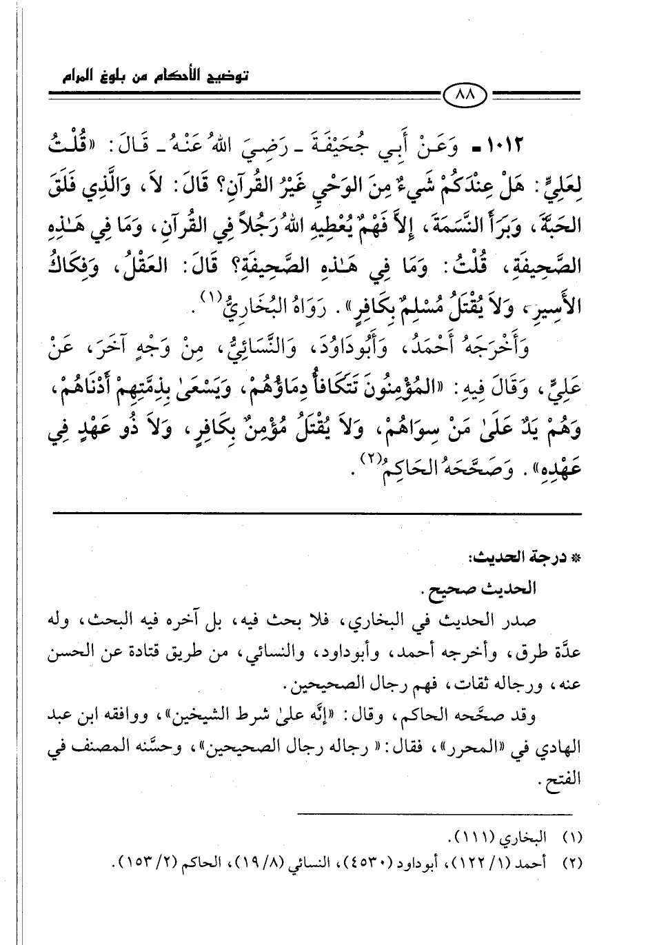 1012 - وَعَنْ أَبِي جُحَيْفَةَ -رَضِيَ اللهُ عَنْهُ- قَالَ: "قُلْتُ لِعَلِيٍّ: هَلْ عِنْدَكُمْ شَيءٌ مِنَ الوَحْيِ غَيْرُ القُرآن؟ قَالَ: لاَ، وَالَّذِي فَلَقَ الحَبَّةَ، وَبَرَأَ النَّسَمَةَ، إِلاَّ فَهْمٌ يُعْطِيهِ اللهُ رَجُلاً فِي القُرآنِ، وَمَا فِي هَذِهِ الصَّحِيفَةِ، قُلْتُ: وَمَا فِي هَذهِ الصَّحِيفَةِ؟ قَالَ: العَقْلُ، وَفِكَاكُ الأَسِيرِ، وَلاَ يُقْتَلُ مُسْلِمٌ بِكَافِرٍ". رَوَاهُ البُخَارِيُّ (¬1).