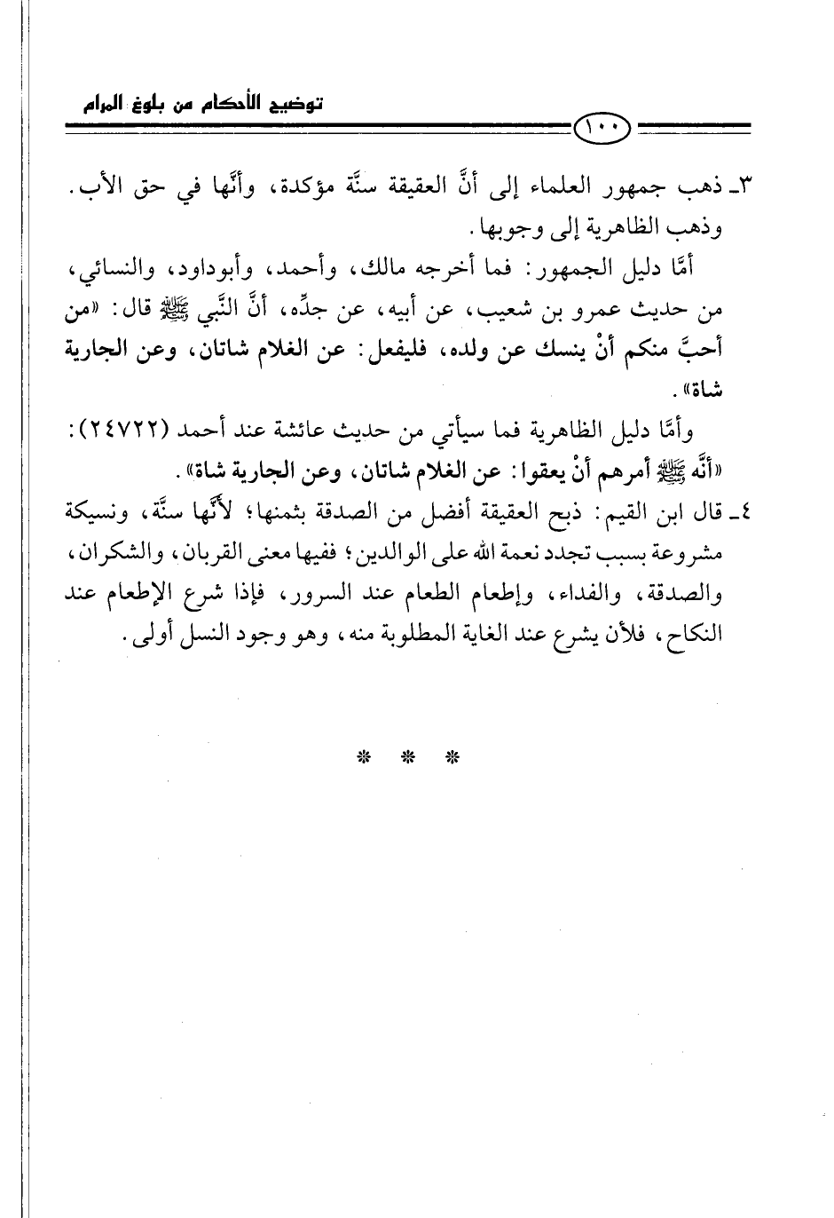 3 - ذهب جمهور العلماء إلى أنَّ العقيقة سنَّة مؤكدة، وأنَّها في حق الأب. وذهب الظاهرية إلى وجوبها.