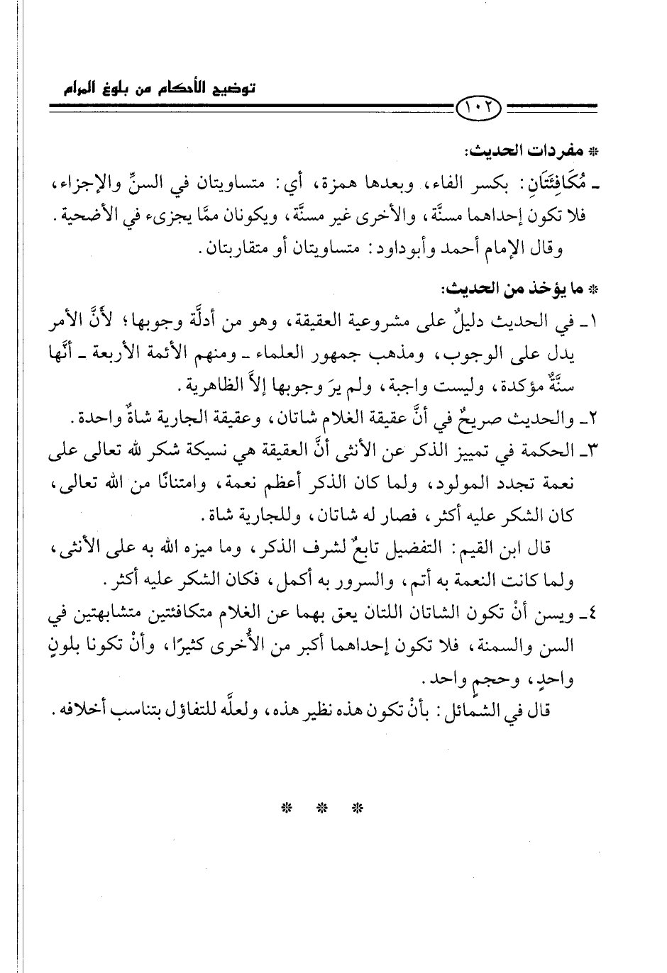 4 - ويسن أنْ تكون الشاتان اللتان يعق بهما عن الغلام متكافئتين متشابهتين في السن والسمنة، فلا تكون إحداهما أكبر من الأخرى كثيرًا، وأنْ تكونا بلونٍ واحدٍ، وحجمٍ واحد.