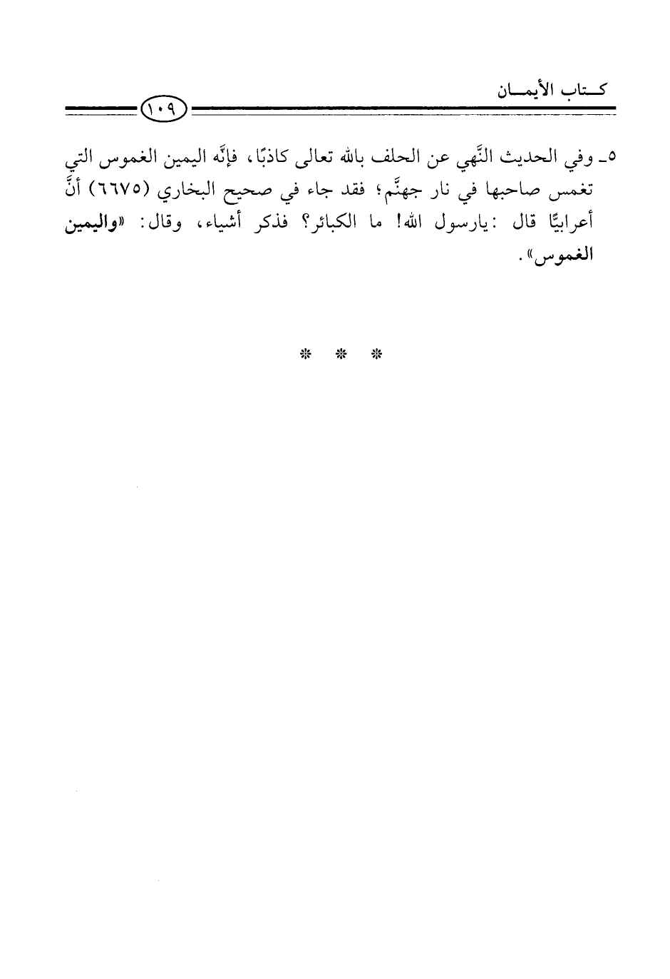 5 - وفي الحديث النَّهي عن الحلف بالله تعالى كاذبًا، فإنَّه اليمين الغموس التي تغمس صاحبها في نار جهنَّم، فقد جاء في صحيح البخاري (6675) أنَّ أعرابيًّا قال: يا رسول الله! ما الكبائر؟ فذكر أشياء، وقال: "واليمين الغموس".