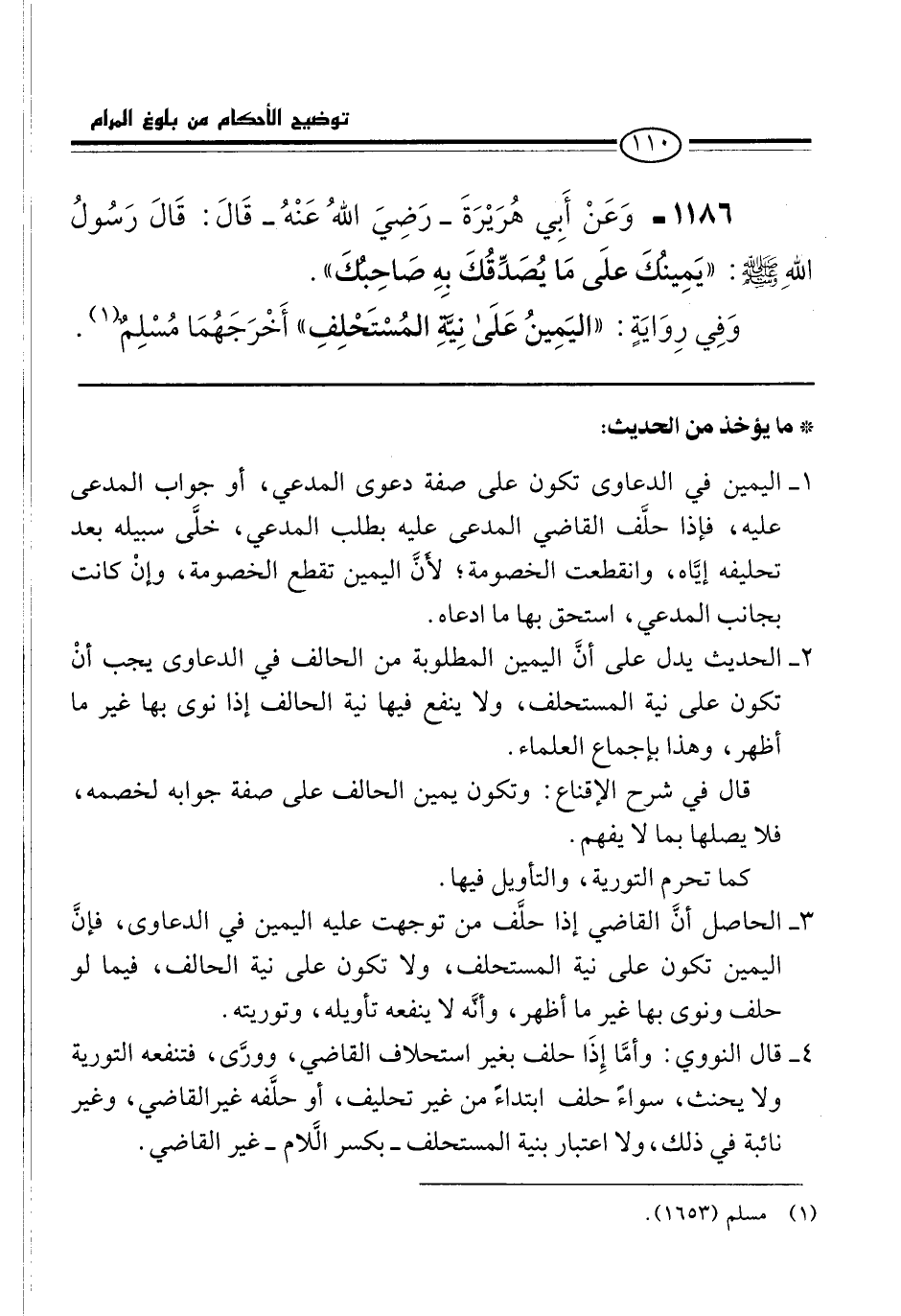 1186 - وَعَنْ أَبِي هُرَيْرَةَ -رَضِيَ اللهُ عَنْهُ- قَالَ: قَالَ رَسُولُ اللهِ -صلى الله عليه وسلم-: "يَمِينُكَ علَى مَا يُصَدِّقُكَ بِهِ صَاحِبُكَ".