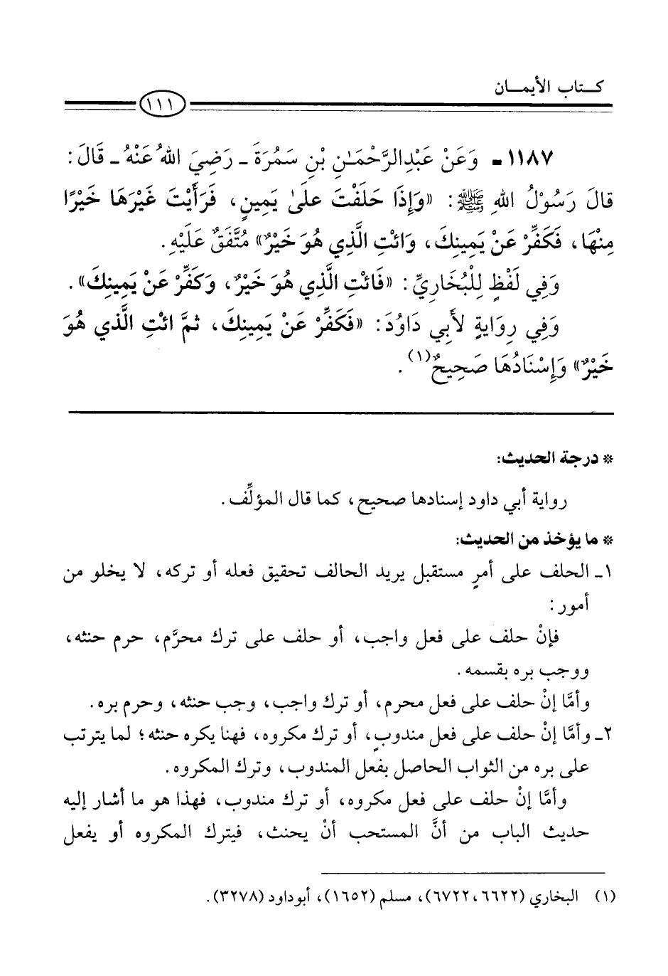 1187 - وَعَنْ عَبْدِ الرَّحْمَنِ بْنِ سَمُرَةَ -رَضِيَ اللهُ عَنْهُ- قَالَ: قالَ رَسُوْلُ اللهِ -صلى الله عليه وسلم-: "وَإِذَا حَلَفْتَ علَى يَمِينٍ، فَرَأَيْتَ غَيْرَهَا خَيْرًا مِنْهَا، فَكَفِّرْ عَنْ يَمِينِكَ، وَائْتِ الَّذِي هُوَ خَيْرٌ" مُتَّفَقٌ عَلَيْهِ.