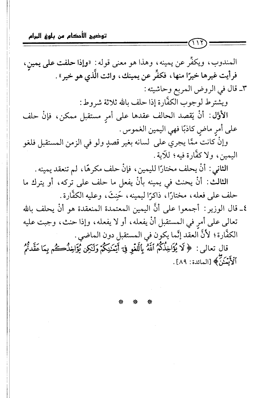 4 - قال الوزير: أجمعوا على أنَّ اليمين المعتمدة المنعقدة هو أنْ يحلف بالله تعالى على أمرٍ في المستقبل أنْ يفعله، أو لا يفعله، وإذا حنث، وجبت عليه الكفَّارة؛ لأنَّ العقد إنَّما يكون في المستقبل دون الماضي.