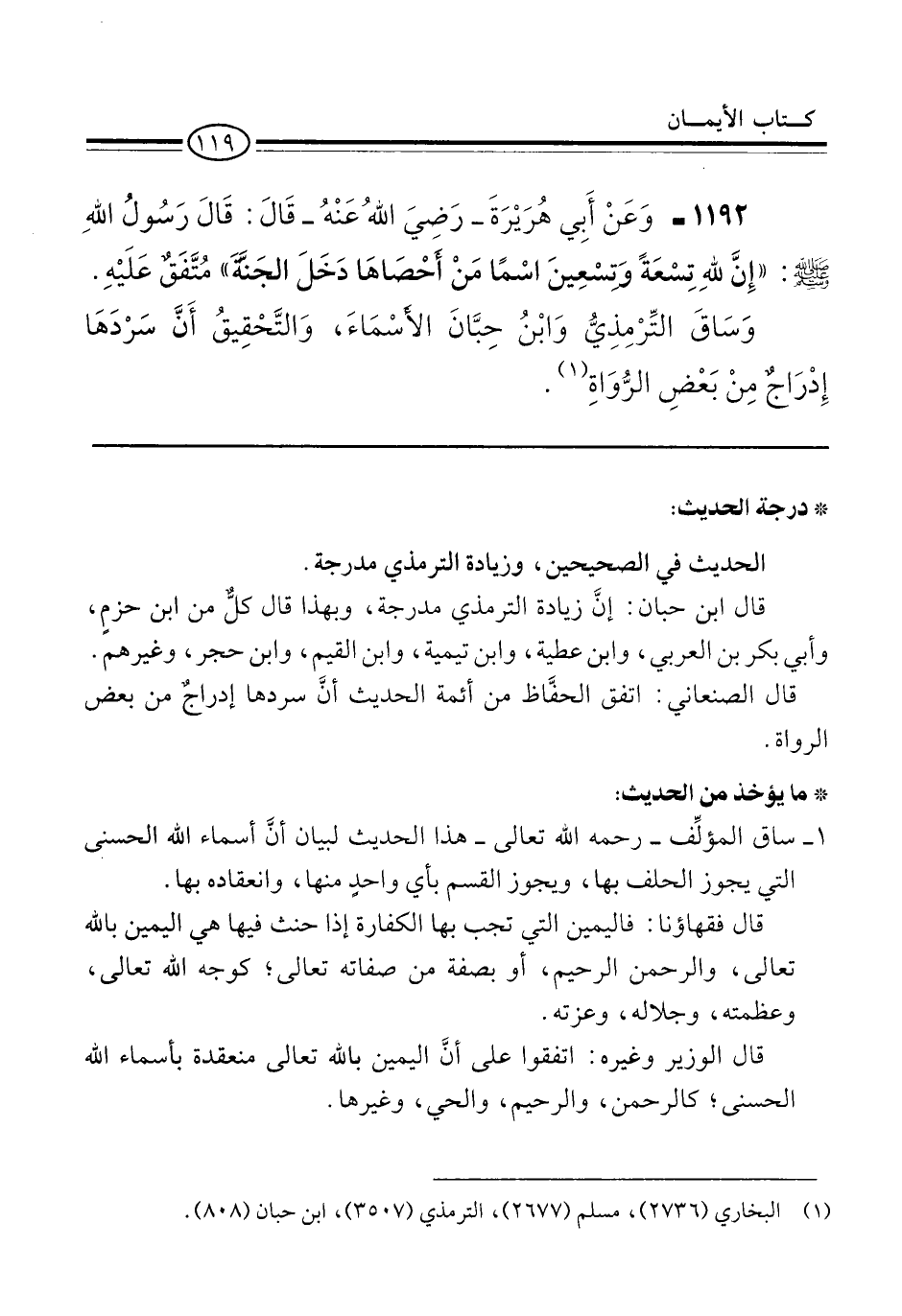 1192 - وَعَنْ أَبِي هُرَيْرَةَ -رَضِيَ اللهُ عَنْهُ- قَالَ: قَالَ رَسُولُ اللهِ -صلى الله عليه وسلم-: "إِنَّ للهِ تِسْعَةً وتسْعِينَ اسْمًا مَنْ احْصَاهَا دَخَلَ الجَنَّة" مُتَّفَقٌ عَلَيْهِ.