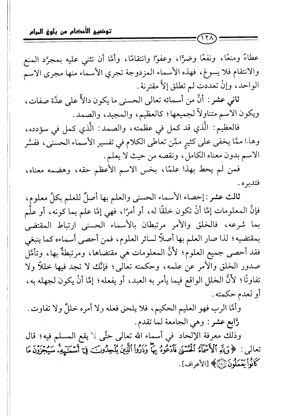 ثاني عشر: أنَّ من أسمائه تعالى الحسنى ما يكون دالًّا على عدَّة صفات، ويكون الاسم متناولاً لجميعها؛ كالعظيم، والمجيد، والصمد.