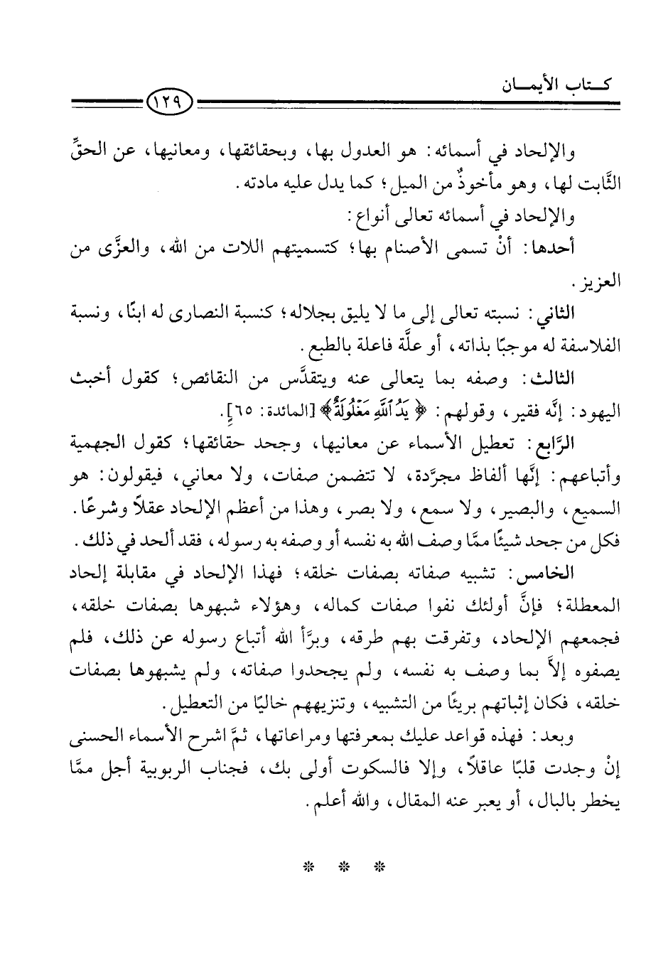 الخامس: تشبيه صفاته بصفات خلقه؛ فهذا الإلحاد في مقابلة إلحاد المعطلة؛ فإنَّ أولئك نفوا صفات كماله، وهؤلاء شبهوها بصفات خلقه، فجمعهم الإلحاد، وتفرقت بهم طرقه، وبرَّأ الله أتباع رسوله عن ذلك، فلم يصفوه إلاَّ بما وصف به نفسه، ولم يجحدوا صفاته، ولم يشبهوها بصفات خلقه، فكان إثباتهم بريئًا من التشبيه، وتنزيههم خاليًا من التعطيل.