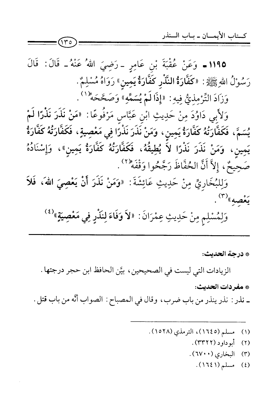 1195 - وَعَنْ عُقْبَةَ بْنِ عَامِرٍ -رَضِيَ اللهُ عَنْهُ- قَالَ: قَالَ رَسُوْلُ اللهِ -صلى الله عليه وسلم-: "كَفَّارَةُ النَّذْرِ كفَّارَةُ يَمِينٍ" رَوَاهُ مُسْلِمٌ.