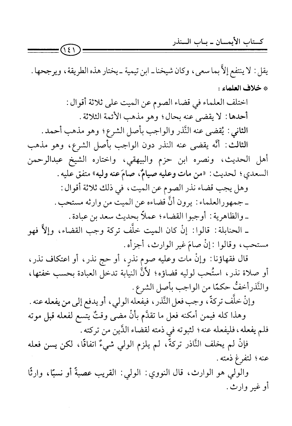 الثالث: أنَّه يقضى عنه النَّذر دون الواجب بأصل الشرع، وهو مذهب أهل الحديث، ونصره ابن حزم والبيهقي، واختاره الشيخ عبد الرحمن السعدي؛ لحديث: "من مات وعليه صيامٌ، صامَ عنه وليه" متفق عليه.