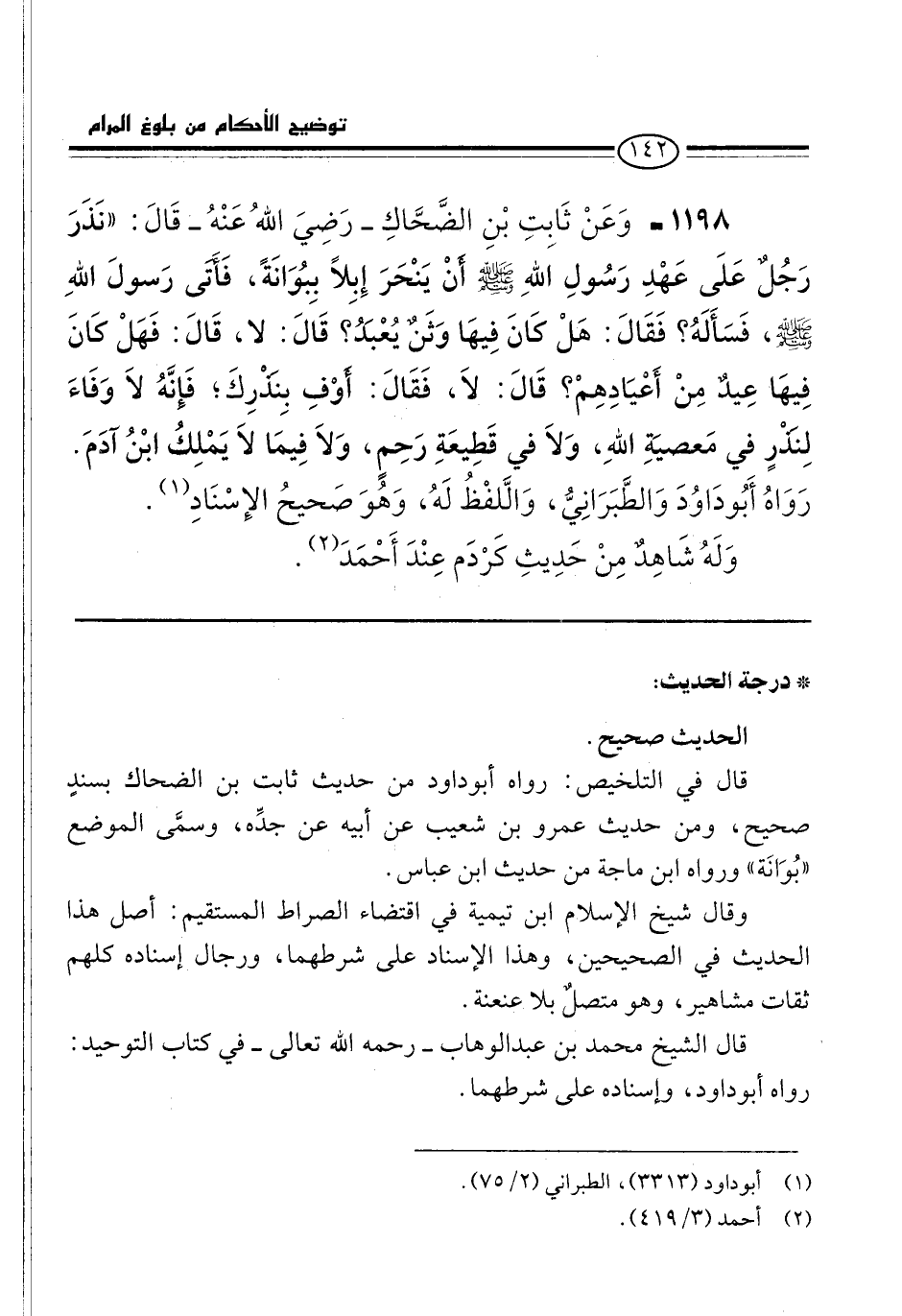 1198 - وَعَنْ ثَابِتِ بْنِ الضَّحَّاكِ -رَضِيَ اللهُ عَنْهُ- قَالَ: "نَذَرَ رَجُلٌ عَلَى عَهْدِ رَسُولِ اللهِ -صلى الله عليه وسلم- أَنْ يَنْحَرَ إِبِلاً بِبُوَانَةً، فَأتى رَسولَ اللهِ -صلى الله عليه وسلم-، فَسَأَلَهُ؟ فَقَالَ: هَلْ كَانَ فِيهَا وَثَنٌ يُعْبَدُ؟ قَالَ: لا، قَالَ: فَهَلْ كَانَ فِيهَا عِيدٌ مِنْ أَعْيَادِهِمْ؟ قَالَ: لاَ، فَقَالَ: أَوْفِ بِنَذْرِكَ، فَإِنَّهُ لاَ وَفَاءَ لِنَذْرٍ في مَعْصيَةِ اللهِ، وَلاَ في قَطِيعَةِ رَحِمٍ، وَلاَ فِيمَا لاَ يَمْلِكُ ابْنُ آدَمَ. رَوَاهُ أَبُو دَاوُدَ وَالطَّبَرَانِيُّ، وَالَّلفْظُ لَهُ، وَهُوَ صَحيحُ الإِسْنَادِ (¬1).